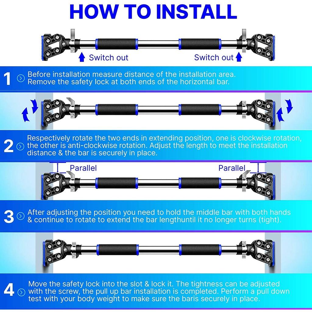 ️ Bước 3: [QUAN TRỌNG]: Dùng tay siết thật chặt tay cầm để lực vặn xà đơn khỏe nhất giúp thanh xà miết chặt vào tường, đẩy chốt khóa vào đúng vị trí chốt, gạt khóa để cố định xà