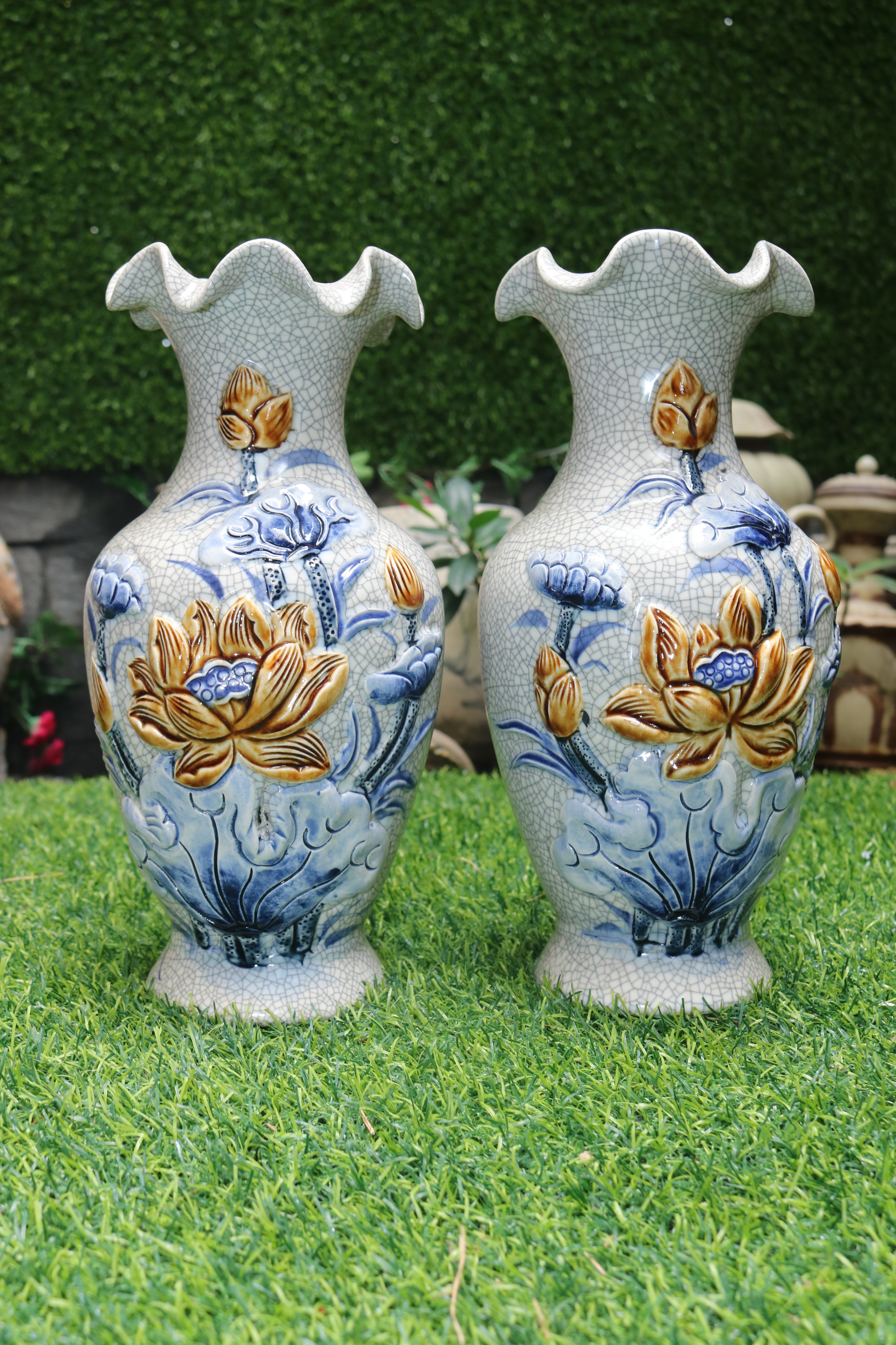 ✨Đôi lọ hoa men rạn đắp nổi sen dáng miệng lượn