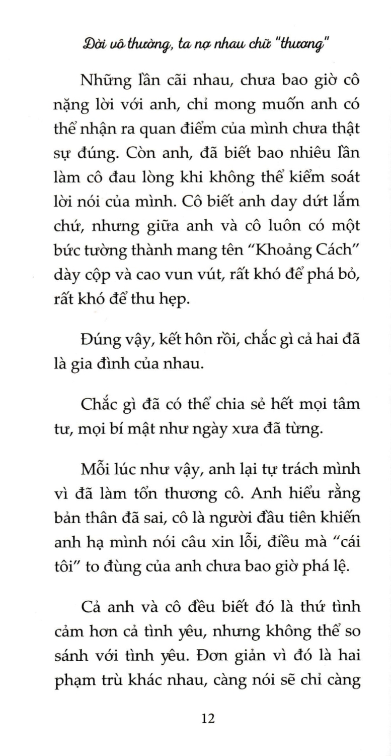 Đời Vô Thường Ta Nợ Nhau Chữ Thương là những câu chuyện với góc nhìn đa chiều về cuộc sống. Bạn nhận ra, cuộc đời luôn biến đổi và “xuôi theo dòng” (flow) là trạng thái tốt đẹp nhất mà chúng ta có thể làm. Không đau lòng chuyện quá khứ, chẳng vướng bận chuyện tương lai, cứ sống hết mình và tận hưởng mọi phút giây của hiện tại.