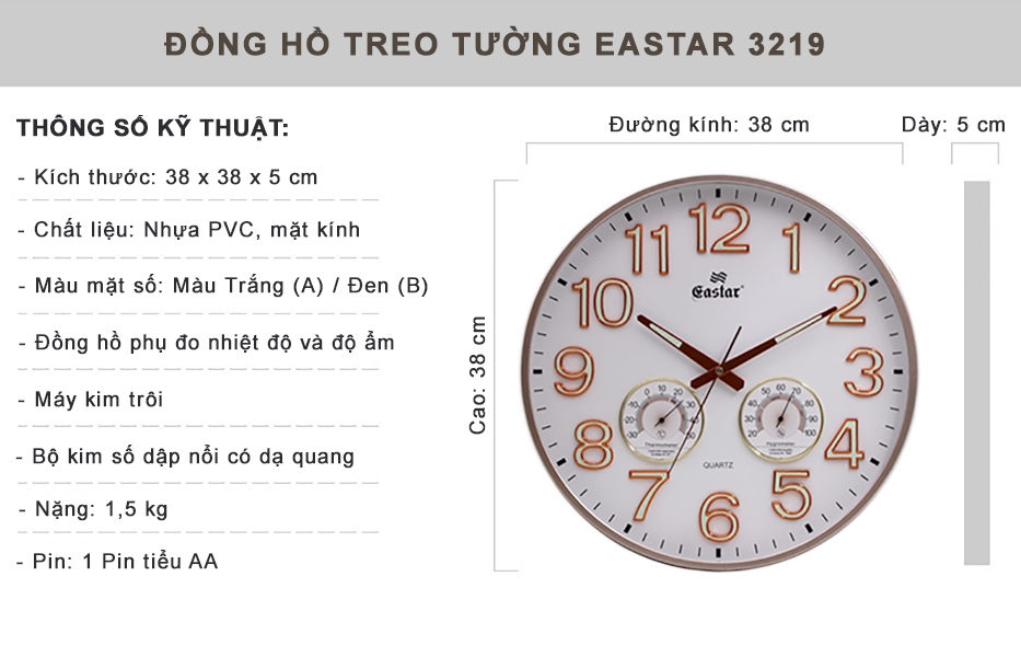 - Đồng Hồ Treo Tường Cao Cấp EASTAR Hình Tròn Viền mỏng, kiểu dáng hiện đại với Đường kính lớn lên tới 38 cm, dày 5 cm.