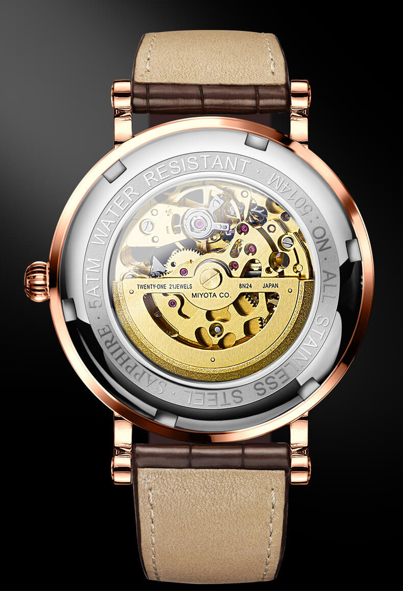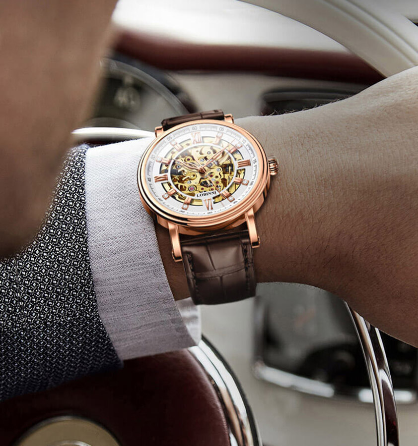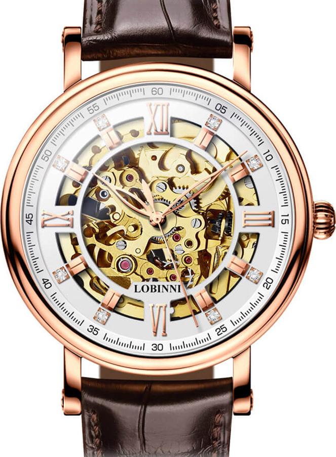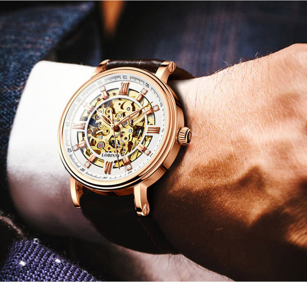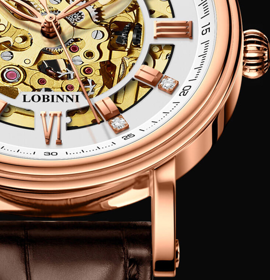 ❏ Vàng hồng 18K: Là vàng nguyên khối, phủ trọn gần như là toàn bộ mặt số đồng hồ LOBINNI L9010-2. Trong khi đó, sự sang trọng lại được kết hợp với nền tảng Skeleton độc đáo, giúp các quý ông chìm đắm ở cả mặt trước lẫn mặt sau thiết kế.