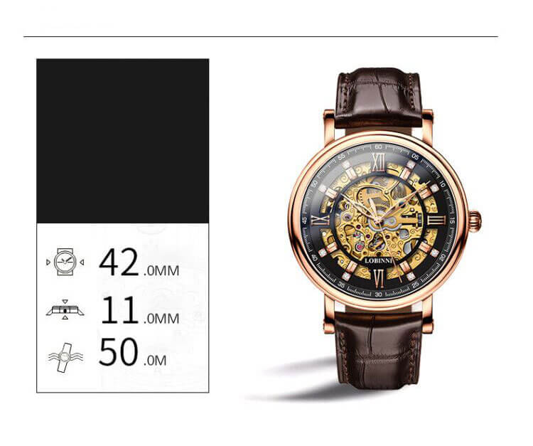 Nhãn hiệu LOBINNI Mã sản phẩm No.9010-1 Giới tính Nam Kiểu máy Automatic (Máy Cơ) Đường kính mặt 42 mm Độ dày 11 mm Chất liệu vỏ Thép không gỉ 316L Chất liệu dây Dây da cao cấp Chất liệu mặt kính Sapphire Khả