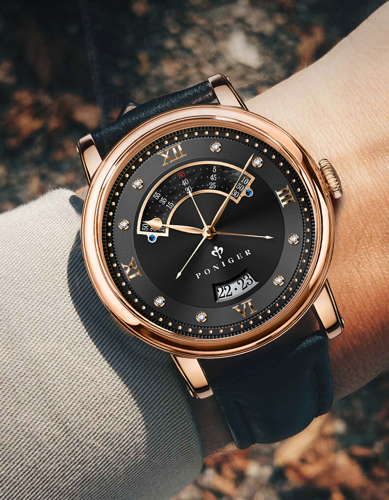 THIẾT KẾ TÁO BẠO: 5 kim thường xuất hiện trên đồng hồ thể thao thì nay đã được Poniger đưa vào cỗ máy thanh lịch với những đường nét thanh thoát hơn, tiết chế hơn và sắc sảo hơn.