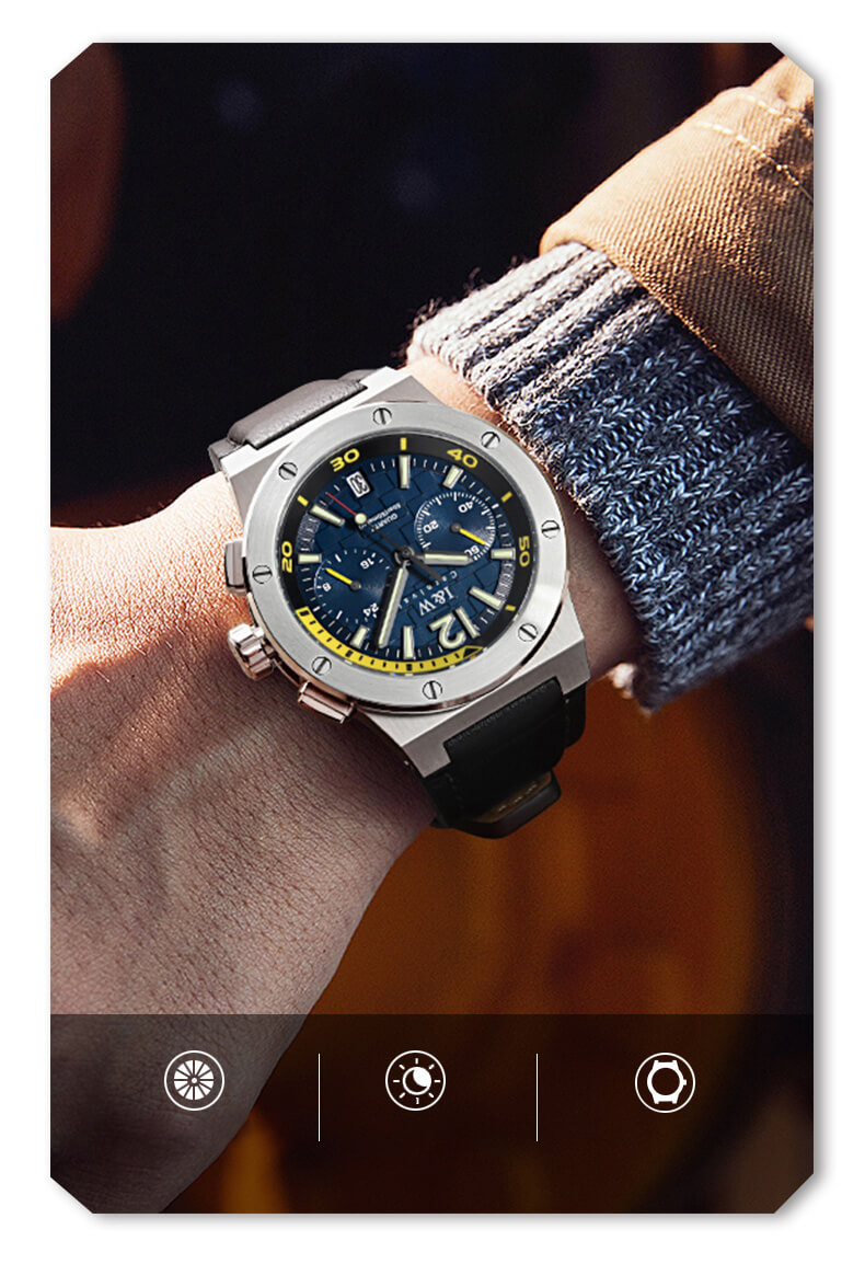 • Quay số 3 chiều, đa tay • Thời gian trôi qua của thời gian • Chịu nước 50 mét - - Vật liệu vỏ case / bezel: thép không gỉ - Một chạm vào
