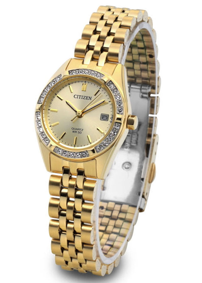 Đồng hồ QC07J204Y với thiết kế mặt đính đá xung quanh viền trong mặt đồng hồ làm nổi bật sự sang trọng và thời trang của sản phẩm Thông số kỹ thuật: - Dây :