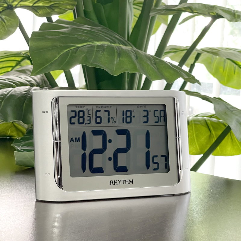 Đồng hồ điện tử Rhythm LCT084NR19, sử dụng 3 pin AA. Vỏ nhựa cao cấp sơn nhũ bạc, kích thước 22.4 x 15.0 x 1,8cm nặng 320g. Màn hình điện tử hiển thị lịch ngày