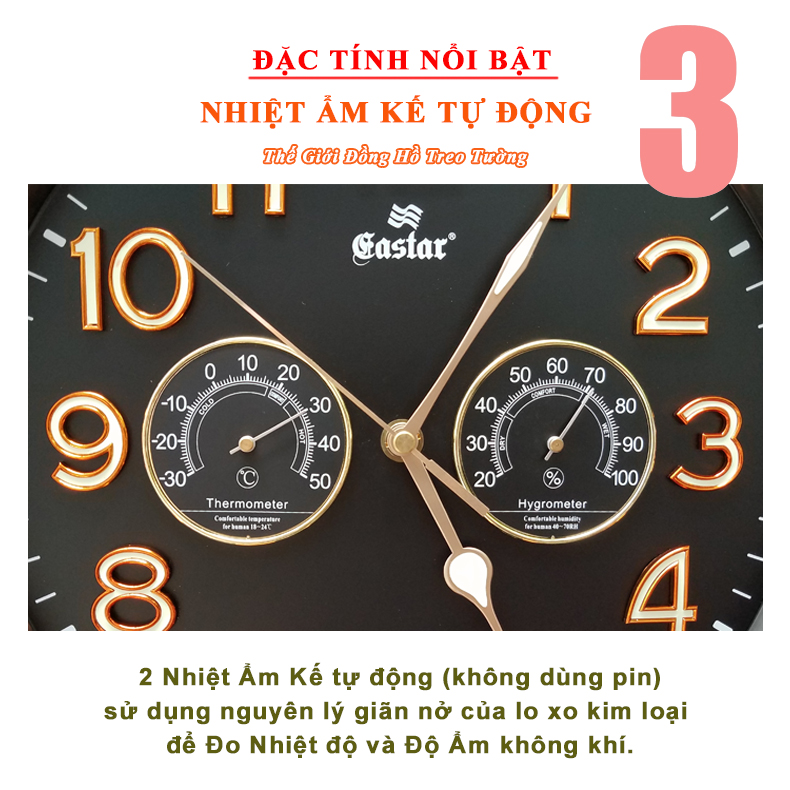 (*) Nhiệt ẩm kế tự động sử dụng nguyên lý co dãn của lò so kim loại dựa trên điều kiện thời tiết để hiển thị nhiệt độ và độ ẩm xung quanh nơi treo đồng hồ. Không nên sử dụng cho mục đích khác. Đây cũng không phải là dụng cụ nhiệt ẩm kế chuyên dụng. Mức sai số của Nhiệt kế là ± 2oC. Mức sai số của Ẩm kế là ± 10%.