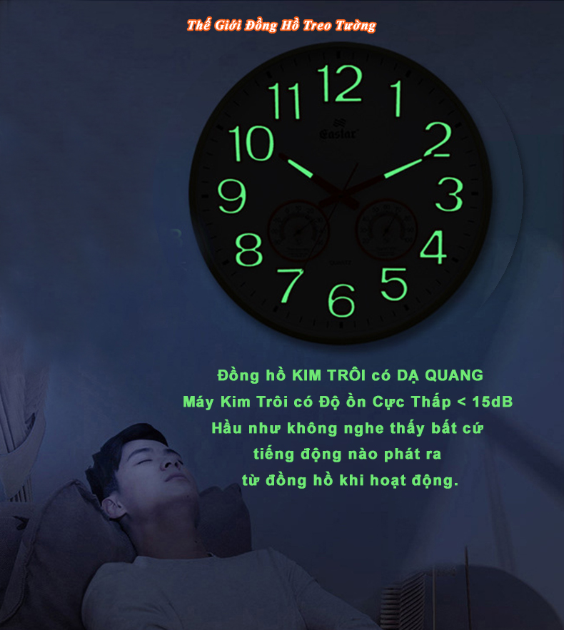 1. ĐẶC ĐIỂM NỔI BẬT: - Đồng hồ Treo tường Cao Cấp EASTAR có Dạ quang (*), máy đồng hồ Kim Trôi mặt tròn  đường kính 34 cm, dày 4,5 cm. - Thiết kế hiện