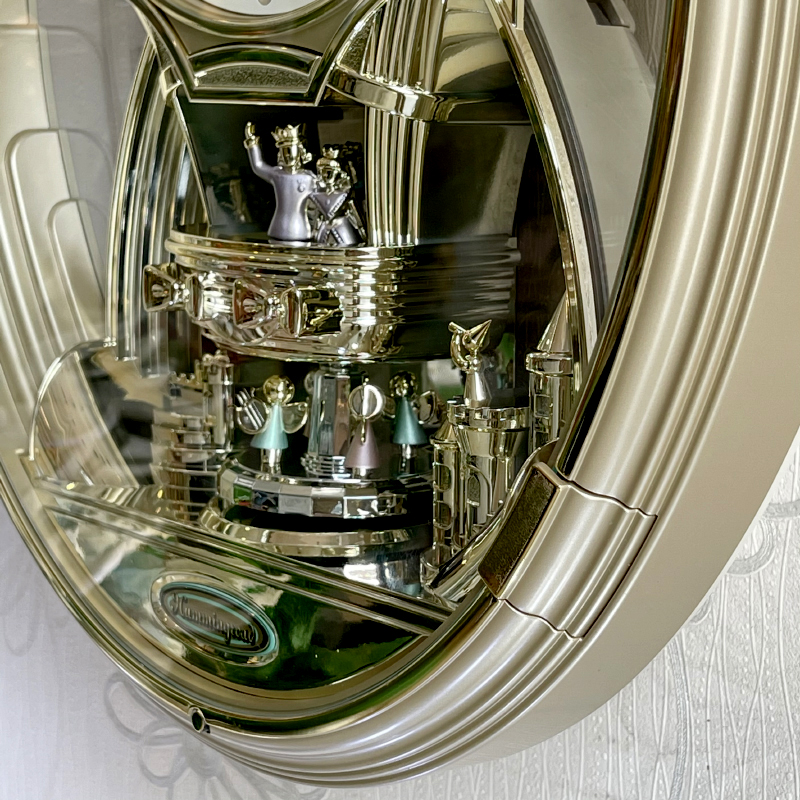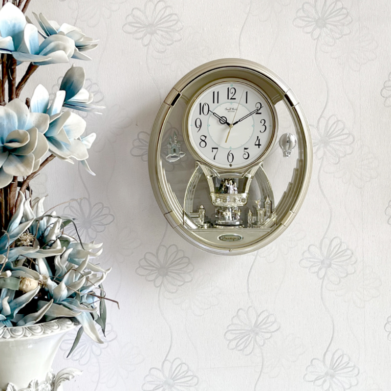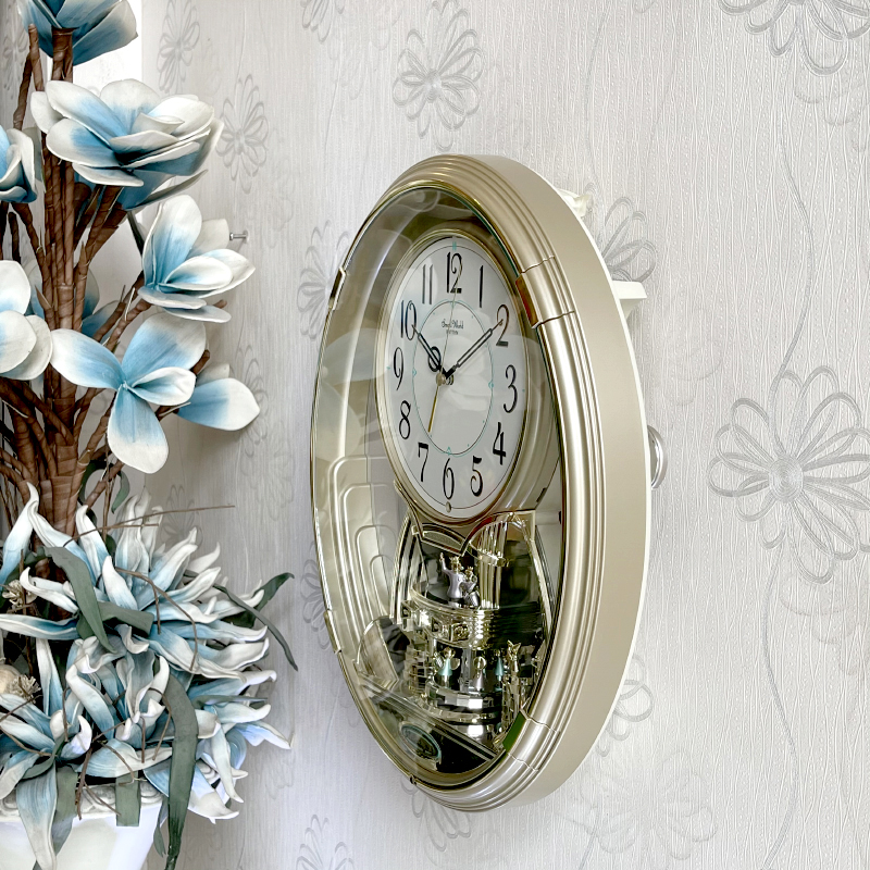 Mua tại TiktokĐồng hồ treo tường Rhythm Magic Motion 4MH736WD18, Dùng 3 pin (C), 1 pin (AA). Vỏ nhựa sơn nhũ vàng sâm banh / mạ vàng cao cấp , Kích thước 34.5 x 41.0 x 8.7cm, trọng lượng 2.8kg. Âm thanh CTS ( Clarion Tone System ) với 6 bản nhạc cổ điển, mắt cảm ứng ánh sáng tự động ngưng phát nhạc khi thiếu sáng. có núm chỉnh âm lượng tiện lợi. Cụm lắc đôi 2 bên và xoay ở vị trí số 6.