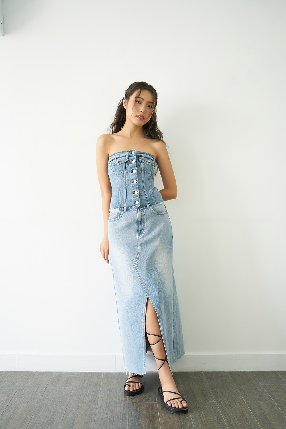 THÔNG TIN SẢN PHẨM DOTTIE - Áo ống vải jeans đắp túi - T0708 - Màu sắc sản phẩm: Xanh đậm - Xanh xám - Chất liệu: Jeans - Ưu điểm : Đứng phom, ít
