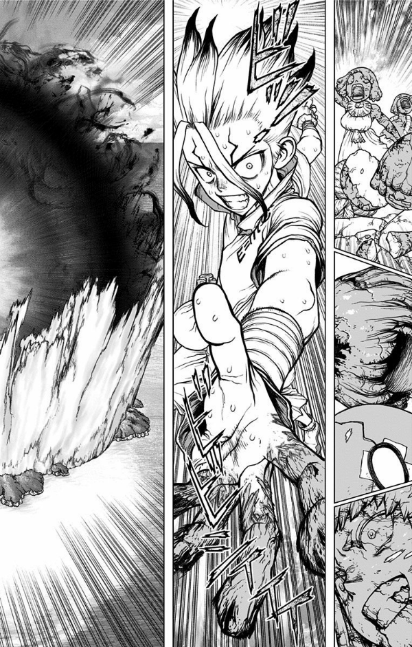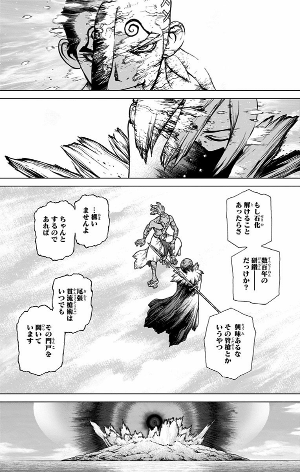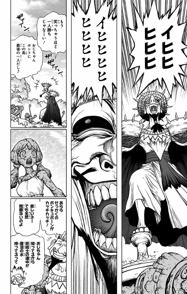 石化王国vs科学王国の戦いは、千空vsイバラの一騎討ちに!! 仲間達の想いを繋ぎ、千空は石化装置を手にできるか!? そして、彼方から届く声“ホワイマン”をめぐる衝撃の事実が、科学王国を新たな冒険へと導く!!