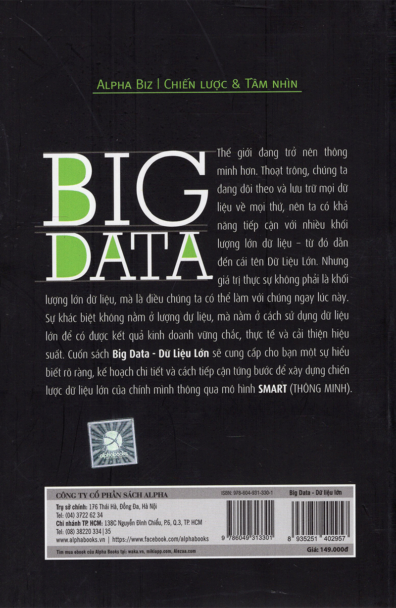 Hiện nay, thế giới đang trở nên thông minh hơn. Chúng ta đang theo dõi và lưu trữ dữ liệu về mọi thứ, nên chúng ta có khả năng tiếp cận với nhiều khối dữ liệu lớn. Tuy nhiên, có rất nhiều vấn đề xoay quanh các khối dữ liệu lớn này. Tất cả chúng ta đều cần phải biết nó là gì và hoạt động như thế nào. Nhưng sự hiểu biết cơ bản về lý thuyết liệu có đủ cho bạn để tổ chức một cuộc họp chiến lược không? Điều khiến bạn trở nên khác với phần còn lại là biết cách sử dụng dữ liệu lớn để cải thiện hiệu suất và có được kết quả kinh doanh vững chắc. Cuốn sách Big Data – Dữ liệu lớn sẽ cung cấp cho bạn một sự hiểu biết rõ ràng, kế hoạch chi tiết và từng bước tiếp cận thông qua mô hình SMART: Khởi dầu với chiến lược, Đo lường các chỉ số và dữ liệu, Áp dụng các phương pháp phân tích, Báo cáo kết quả, Biến đổi doanh nghiệp.