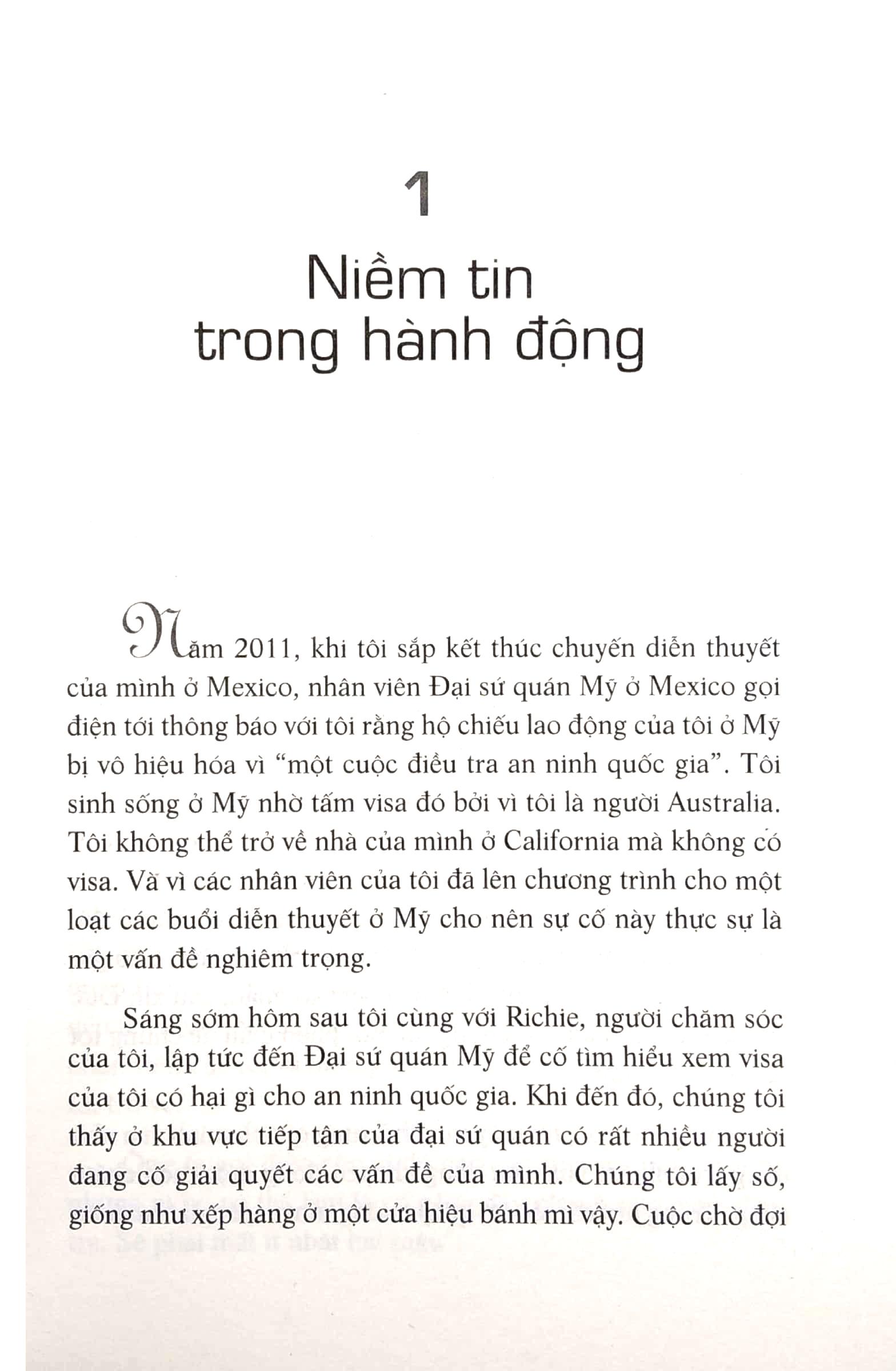 Đừng Bao Giờ Từ Bỏ Khát Vọng - Unstoppable Chào mừng các bạn đến với cuốn sách thứ hai của tôi. Tên tôi là Nick Vujicic. Có thể bạn chưa đọc cuốn sách đầu tay của tôi, cuốn Cuộc sống không giới hạn, nhưng bạn có thể đã từng xem những video của tôi trên YouTube hoặc đã dự một trong những buổi diễn thuyết vòng quanh thế giới của tôi. Nhìn ảnh của tôi trên bìa sách, các bạn có thể biết tôi sinh ra không có chân, không có tay. Điều mà các bạn không thể nhìn thấy nhưng có thể cảm nhận được là sự khuyết thiếu tứ chi này không thể ngăn cản tôi tận hưởng những chuyến phiêu lưu thú vị, không thể ngăn cản tôi vươn tới một sự nghiệp đầy ý nghĩa và mãn nguyện, càng không thể cản trở tôi có được những mối quan hệ đầy tình yêu thương. Tôi viết cuốn sách này với mục đích chia sẻ với các bạn sức mạnh không gì ngăn cản được của niềm tin trong hành động, nguồn sức mạnh đã giúp tôi tạo lập một cuộc sống tốt đẹp đến mức diệu kỳ, bất chấp những khuyết tật nặng nề. Đặt niềm tin vào hành động có nghĩa là tin tưởng và đạt được thành quả. Đó là niềm tin vào bản thân bạn, tài năng của bạn, mục đích của bạn, và quan trọng hơn hết, là niềm tin vào tình yêu của Đấng Sáng Tạo và những kế hoạch quan trọng mà Người dành cho cuộc đời bạn. Nguồn cảm hứng để tôi viết cuốn sách này đến từ những người thuộc mọi lứa tuổi trên khắp thế giới, những người tôi đã cho lời khuyên và hướng dẫn họ đương đầu với những thách thức trong cuộc sống. Từ những buổi diễn thuyết của tôi, họ biết rằng tỏi đã vượt qua nghịch cảnh, thậm chí vượt qua ý định tự vẫn đã thoáng hiện trong tôi vài lần khỉ tôi còn nhỏ, khi tôi vật vã với những câu hỏi làm thế nào tôi có thể tự nuôi sống m.ình, liệu tôi có tìm được một người phụ nữ yêu tôi hay không, khi tôi chìm trong cảm giác buồn khổ và chán chường vi bị bắt nạt, bị chế giễu, và vì nhiều vấn đề khác, nhiều nỗi bất ổn khác bủa vây. Các chương trong cuốn sách này xoay quanh những câu hỏi và những thách thức mà mọi người nêu ra khi họ nói chuyện và viết thư cho tôi. Đó là: Những khủng hoảng cá nhân; Những vấn đề liên quan đến các mối quan hệ; Những thách thức trong công việc và sự nghiệp; Những mối quan tâm về sức khỏe và khuyết tật; Những ý nghĩ, cảm xúc tiêu cực và các chứng nghiện ngập; Sự bắt nạt, khủng bố, sự tàn nhẫn và thiếu khoan dung; Việc đương đầu với những vấn đề vượt ngoài tầm kiểm soát của chúng ta; Cách tiếp cận và giúp đỡ người khác; Cách tìm được sự thăng bằng về thể chất, tinh thần, trái tim và tâm hồn. Tôi hy vọng rằng việc chia sẻ những câu chuyện của tôi và của những người khác, những người đã kiên trì vượt qua bao khó khăn thử thách trong cuộc sống - nhiều người trong số họ đáng khâm phục hơn tôi nhiều - sẽ giúp ích và khích lệ các bạn vượt qua những thách thức mà các bạn đang phải đối mặt. Dĩ nhiên tôi không có tất cả mọi câu trả lời. Nhưng tôi sẽ trao cho các bạn tất cả những gì mà tôi đã có được từ những lời khuyên tuyệt vời của những con người thông thái cũng như từ tình yêu và phước lành của Chúa. Tôi nghĩ các bạn sẽ nhận thấy sự chia sẻ của tôi trong những trang sách này giàu tính thực tiễn và đầy tính khích lệ. Bạn hãy luôn nhớ một điều rất quan trọng rằng bạn không bao giờ đơn độc. Bạn luôn luôn có sự giúp đỡ của bạn bè, gia đình, thầy cô giáo, những người cố vấn và hỗ trợ tinh thần cho bạn. Đừng bao giờ nghĩ rằng bạn phải một m.ình đương đầu với những gánh nặng của m.ình. Bạn cũng nên biết rằng trên đời này vẫn còn rất nhiều người đã và đang phải đương đầu với những thách thức như bạn. Cuốn sách này sẽ kể với bạn nhiều câu chuyện về những con người mà tôi quen biết và những người đã viết thư cho tôi để chia sẻ kinh nghiệm của họ. Trong một số trường hợp tôi đã thay đổi tên nhân vật, nhưng những câu chuyện được kể thì hoàn toàn là sự thật và luôn tràn đầy sự khích lệ bởi đó là những câu chuyện về lòng dũng cảm, niềm tin và ý chí sắt đá. Khi còn là một cậu bé phải cố gắng thích nghi với những khuyết tật của m.ình, tôi đã thật sai lầm khi nghĩ ràng không ai trên đời này phải chịu đựng những nỗi đau như tôi và rằng những khó khăn của tôi khủng khiếp đến mức không thể vượt qua nổi. Tôi cứ nghĩ rằng sự khuyết thiếu tứ chi của tôi là bằng chứng cho thấy Đấng Sáng Tạo không yêu thương tôi và rằng cuộc đời tôi chẳng có mục đích gì hết. Tôi cũng cảm thấy rằng tôi không thể chia sẻ gánh nặng của m.ình - không thể chia sẻ ngay cả với những người luôn yêu thương và quan tâm đến tôi. Tôi đã lầm. Tôi không hề đơn độc trong khó khăn và đau đớn. Quả thật trên đời này có nhiều người đã v