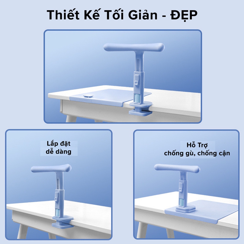 Bộ dụng cụ vừa giúp trẻ không cúi sát hoặc nằm oải trên mặt bàn, đồng thời đẩy phần ngực được khoảng cách chuẩn xác so với bàn học