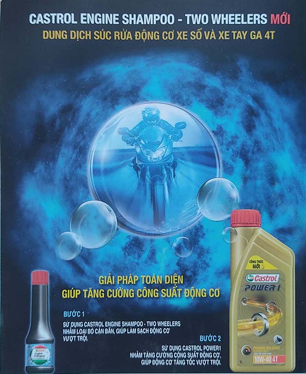 Điều kiện lái xe hiện đại khiến động cơ xe máy làm việc khắc nghiệt hơn, hình thành bụi bẩn và cặn bùn tích tụ bên trong động cơ. Nếu không được loại bỏ hoàn toàn khi thay dầu động cơ, các cặn bẩn này gây ảnh hưởng trực tiếp đến hoạt động của động cơ. Castrol Engine Shampoo - Two Wheelers là giải pháp súc rửa động cơ trước khi thay dầu, loại bỏ đến 85% cặn bẩn* bên trong động cơ, giúp làm sạch động cơ hiệu quả. Lợi điểm Làm sạch vượt trội giúp tăng cường công suất động cơ. Hướng dẫn sử dụng: Chuẩn bị: