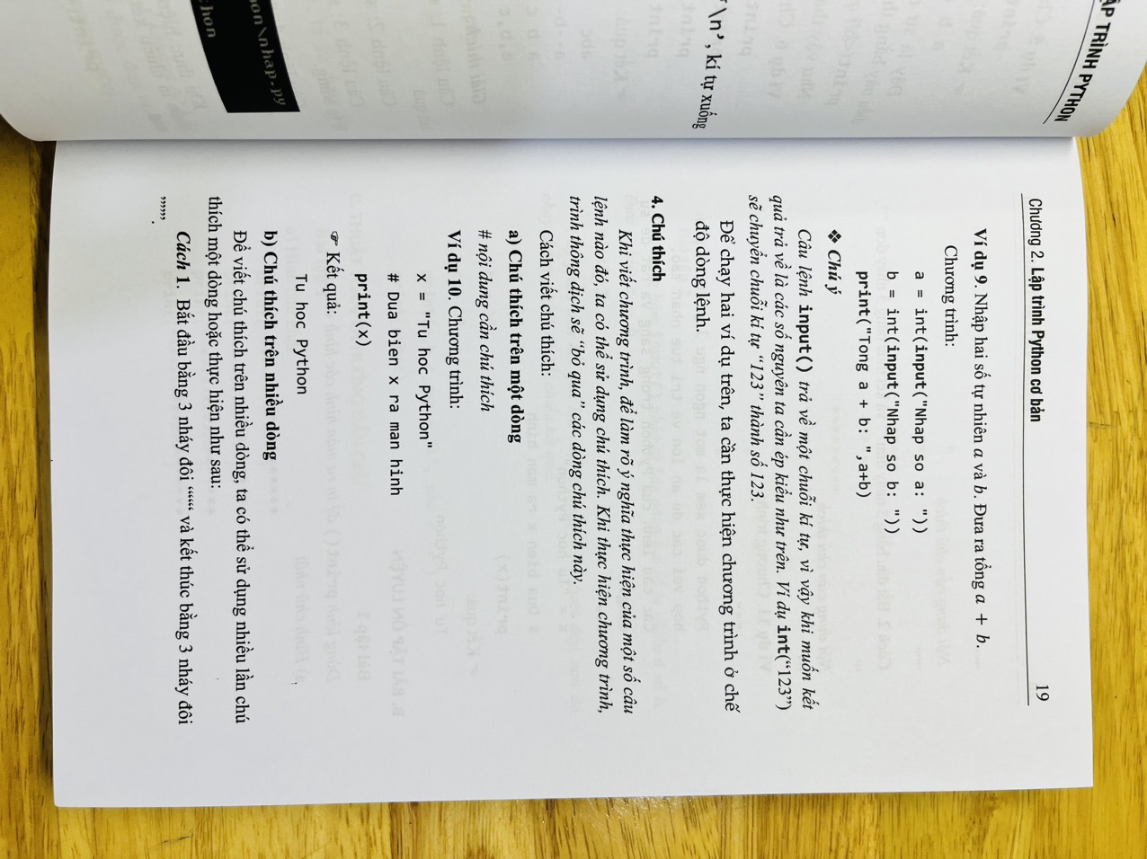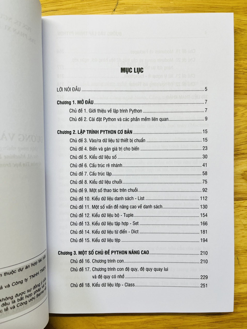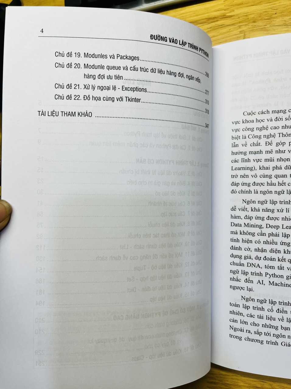 Sách Đường Vào Lập Trình Python Ngôn ngữ lập trình Python không những đáp ứng được yêu cầu của các bài toán lập trình cổ điển trước đây mà còn đáp ứng được các bài toán lập trình mới. Tuy nhiên, các tài liệu về lập trình Python ở nước ta còn thiếu. Đó là rào cản lớn cho những bạn muốn sử dụng ngôn ngữ này trong lập trình. Ngoài ra, sắp tới ngôn ngữ lập trình Python sẽ được đưa vào giảng dạy trong chương trình giáo dục phổ thông môn Tin học nên việc biên soạn tài liệu có chất lượng về Python cho các em học sinh là một việc làm rất cần thiết. Cuốn sách Sách Đường Vào Lập Trình Python là sản phẩm "thai nghén" trong một thời gian dài vừa viết, vừa phản biện sao cho thành phẩm cuối cùng được ưng ý nhất. Cuốn sách có 22 chủ đề được viết theo lối viết sưu phạm. Ngoài ra chương 1 là chương về kiến thức mở đầu ra thì các chươn còn lại có cấu trúc chung như sau: A. Đặt vấn đề B. Bài tập ôn luyện C. Thuật toán và hướng dãn giải Nội dung cuốn sách bàn về những vấn đề cơ bản của lập trình như cấu trúc lặp, kiểu dữ liệu chuỗi, … cũng như những vấn đề nâng cao, hiện đại như quay lui, hàng đợi, ngăn xếp, đồ họa,kiểu dữ liệu từ điển, …Chính vì thế cuốn sách đáp ứng được mọi nhu cầu từ thấp đến cao, từ đơn giản đến phức tạp của tất cả các em học sinh phổ thông, Trung học, sinh viên, học viên cao học ngành Khoa học máy tính, quý thầy cô và nhà nghiên cứu muốn tìm hiểu về ngôn ngữ lạp trình Python. Những ai quan tâm đến lập trình Python đều tìm thấy nhiều điều bổ ích từ cuốn sách Sách Đường Vào Lập Trình Python.