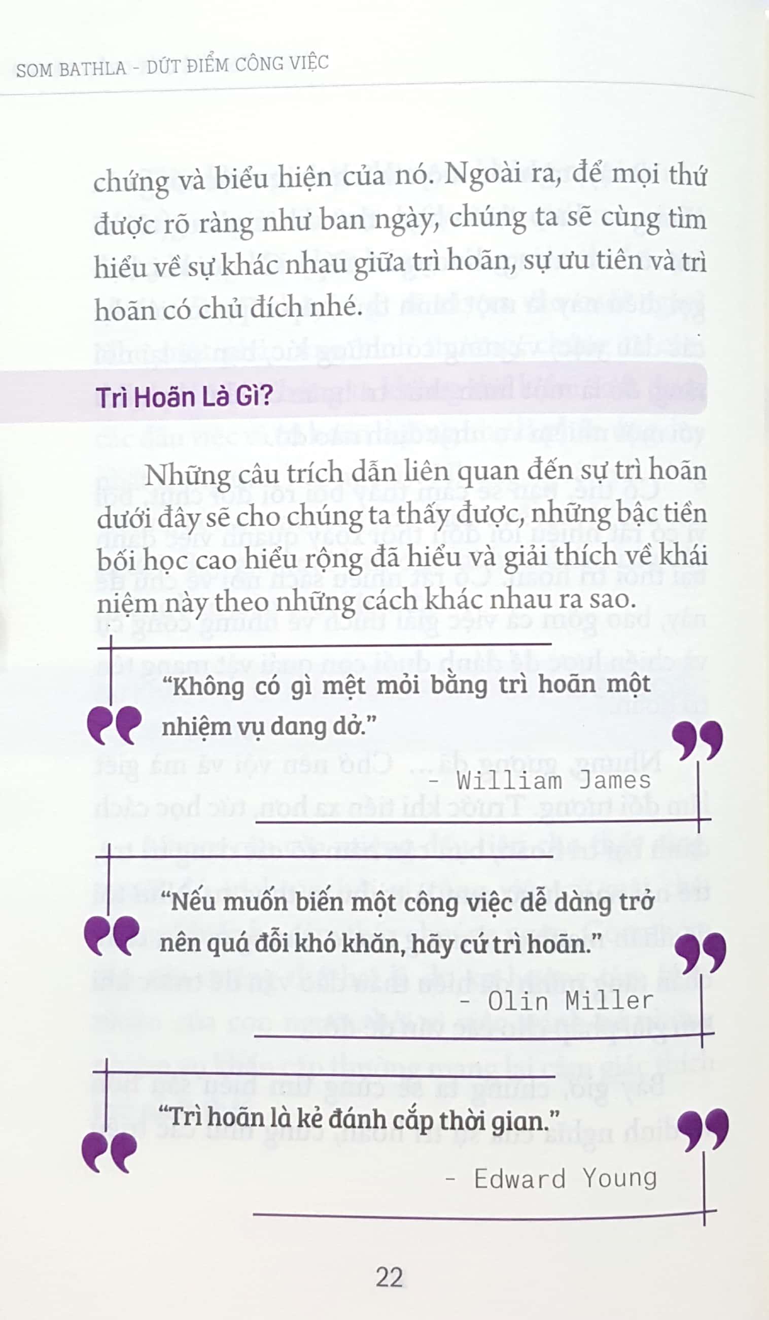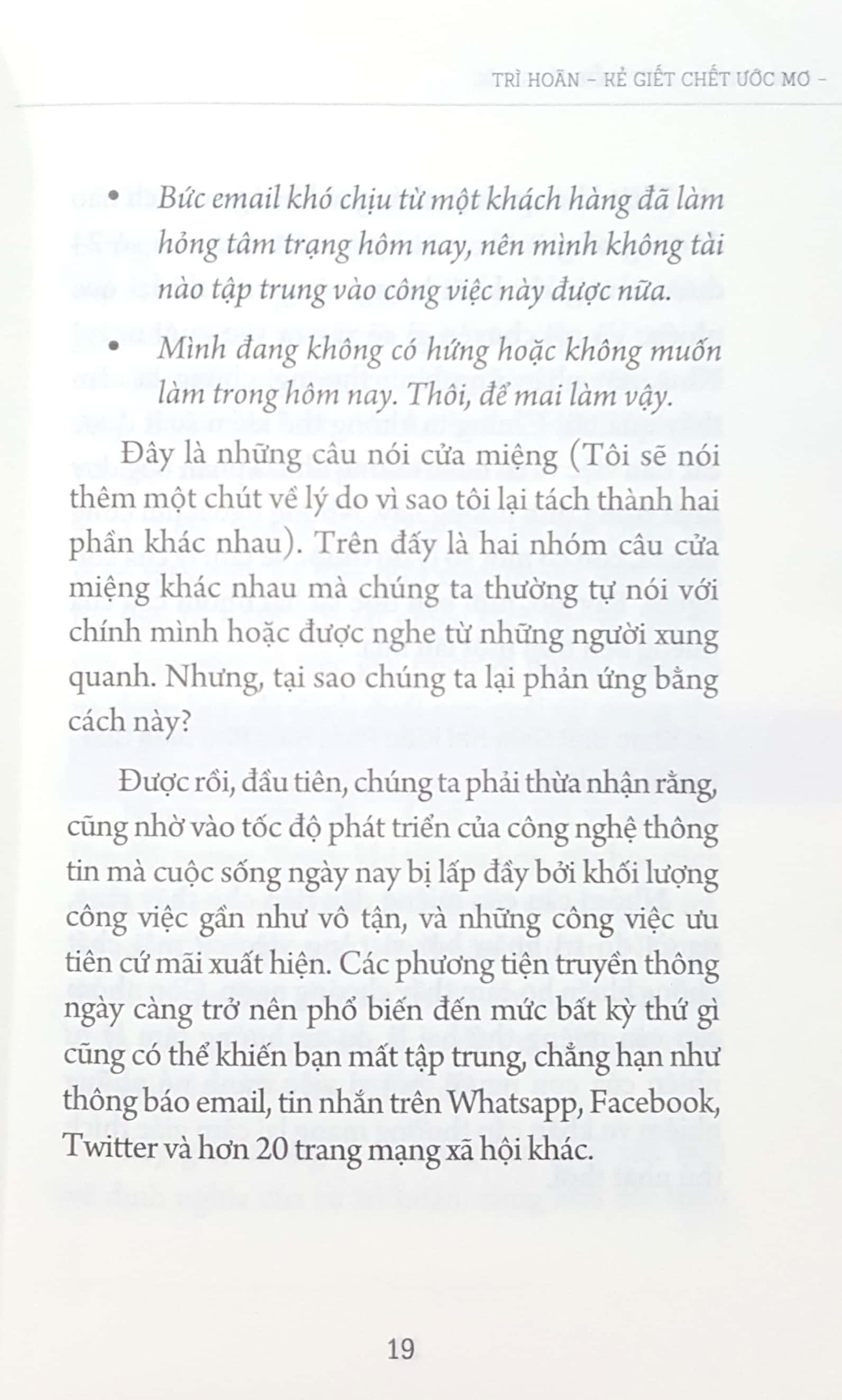 Mua tại Tiktok“Chẳng thể nào tìm lại thời gian đã mất.” - Benjamin Franklin Bằng ngòi bút tinh tế và giọng văn hóm hỉnh, Som Bathla vạch trần những lý do, lối suy nghĩ dẫn chúng ta đến với sự trì hoãn; phân biệt những nhầm lẫn có thể có giữa sự trì hoãn vô hại và có hại; và quan trọng hơn, ông còn đề ra tậ 27 cách để khắc phục thói quen trì hoãn. Hy vọng, bạn đọc sẽ tìm được chiến lược đối phó với một trong những con quái vật dữ tợn nhất của thế giới hiện đại, sự Trì Hoãn. “Quyển sách này quả thực là một phương thuốc dành cho những độc giả đang gặp khó khăn với thói trì hoãn và mang đến những hướng dẫn tuyệt diệu của Som Bathla về cách thức tự tạo động lực. Đúng là một quyển sách đáng đọc!” – Khushi Parmar, độc giả trên Amazon.
