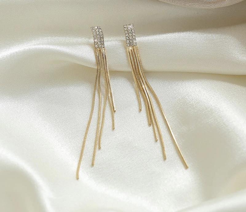 Earrings đeo tai nữ dáng dài tua rua đính đá lấp lánh • Chất liệu: Hợp kim cao cấp an toàn với da. • Thiết kế tinh xảo, đẳng cấp và style trẻ trung, thời