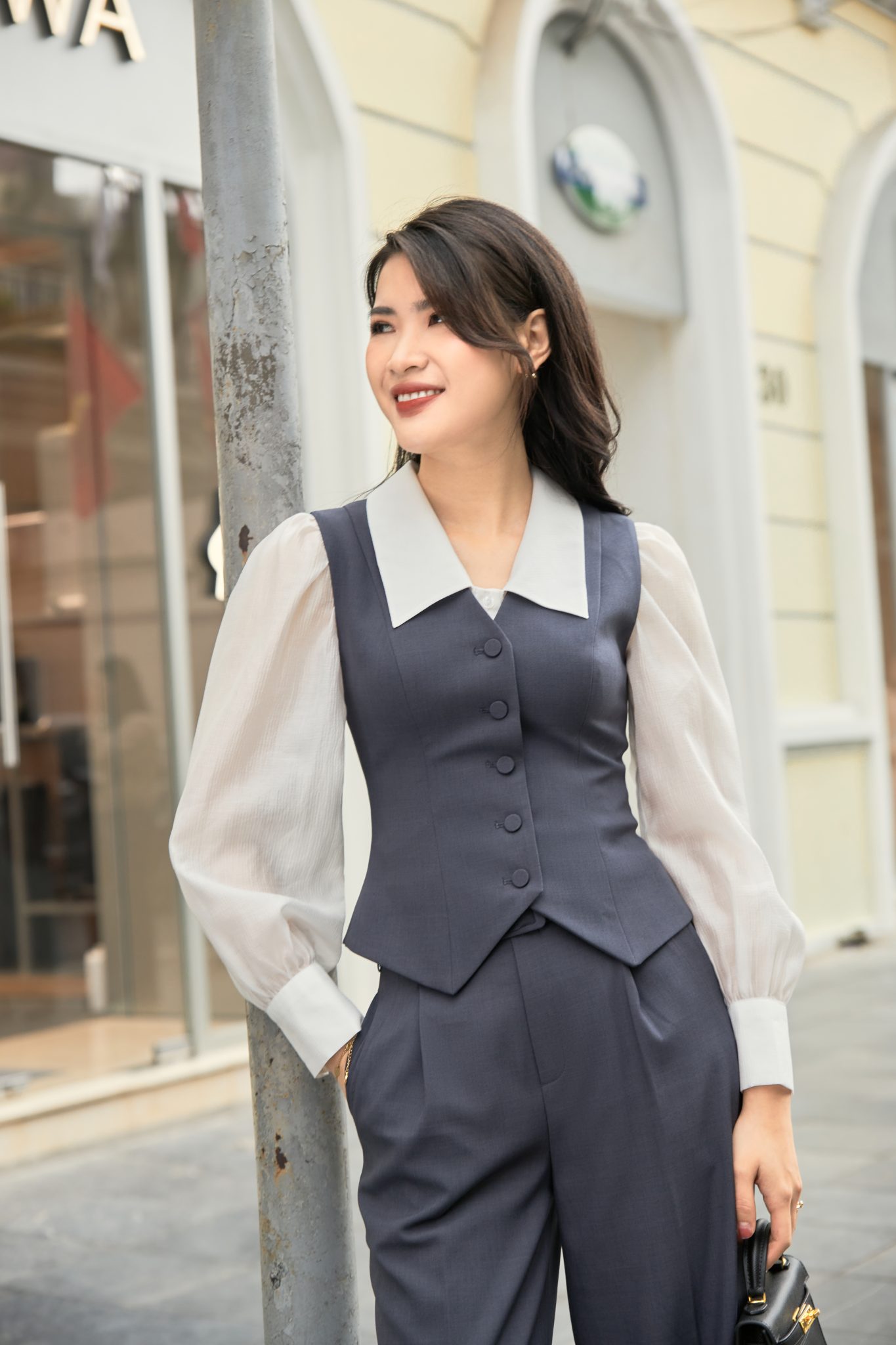 1. Thông tin sản phẩm: VALEN ELOISE - PHONG CÁCH THỜI TRANG CHỈN CHU VÀ CHUYÊN NGHIỆP Áo gile Valen form ôm, phối cùng quần Eloise ống suông cạp cao xếp ly giúp che