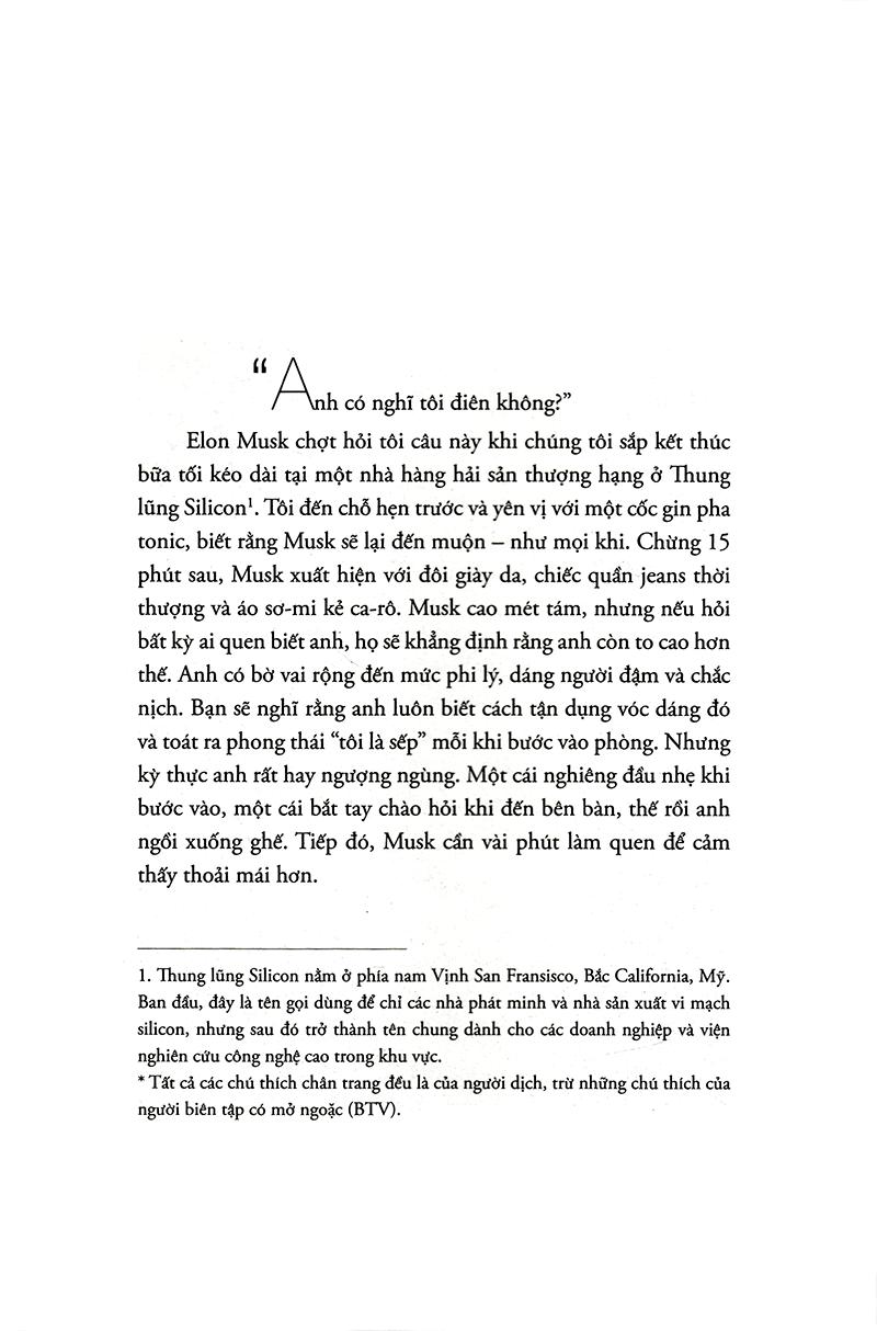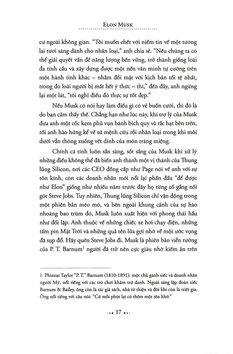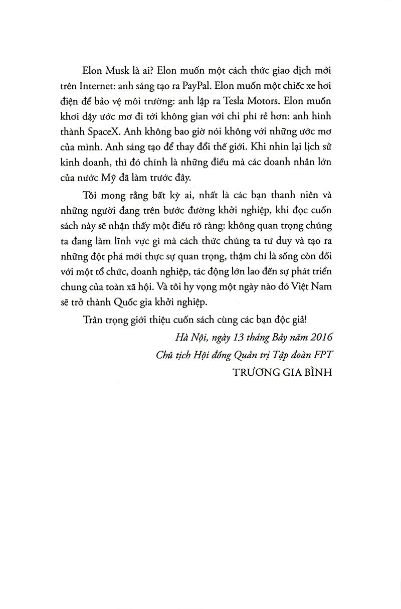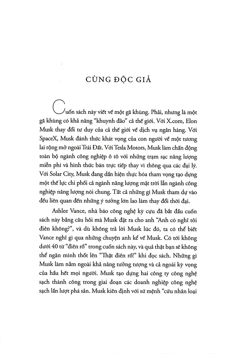 Trong cuốn Elon Musk: Tesla, SpaceX và sứ mệnh tìm kiếm một tương lai ngoài sức tưởng tượng, nhà báo công nghệ kỳ cựu Ashlee Vance đã mở cánh cửa đầu tiền nhìn vào cuộc sống phi thường của doanh nhân táo bạo nhất thung lũng Silicon. Được viết với độc quyền tiếp cận Musk, gia đình và bạn bè anh, cuốn sách lần theo cuộc hành trình của doanh nhân này, từ thuở nhỏ được nuôi dạy ở Nam Phi đến khi lên đến đỉnh cao của giới kinh doanh toàn cầu. Vance dành hơn 30 giờ trò chuyện với Musk và phỏng vấn gần 300 người để kể những câu chuyện đầy biến động về các công ty đang làm thay đổi thế giới mà Musk thành lập: PayPal, Tesla Motors, SpaceX và SolarCity, và để mô tả một người đàn ông đã tạo sức sống mới cho ngành công nghiệp Mỹ và thổi bùng tinh thần đổi mới ở một cấp độ khác, trong khi cũng tạo nên không ít kẻ thù trên con đường đó.