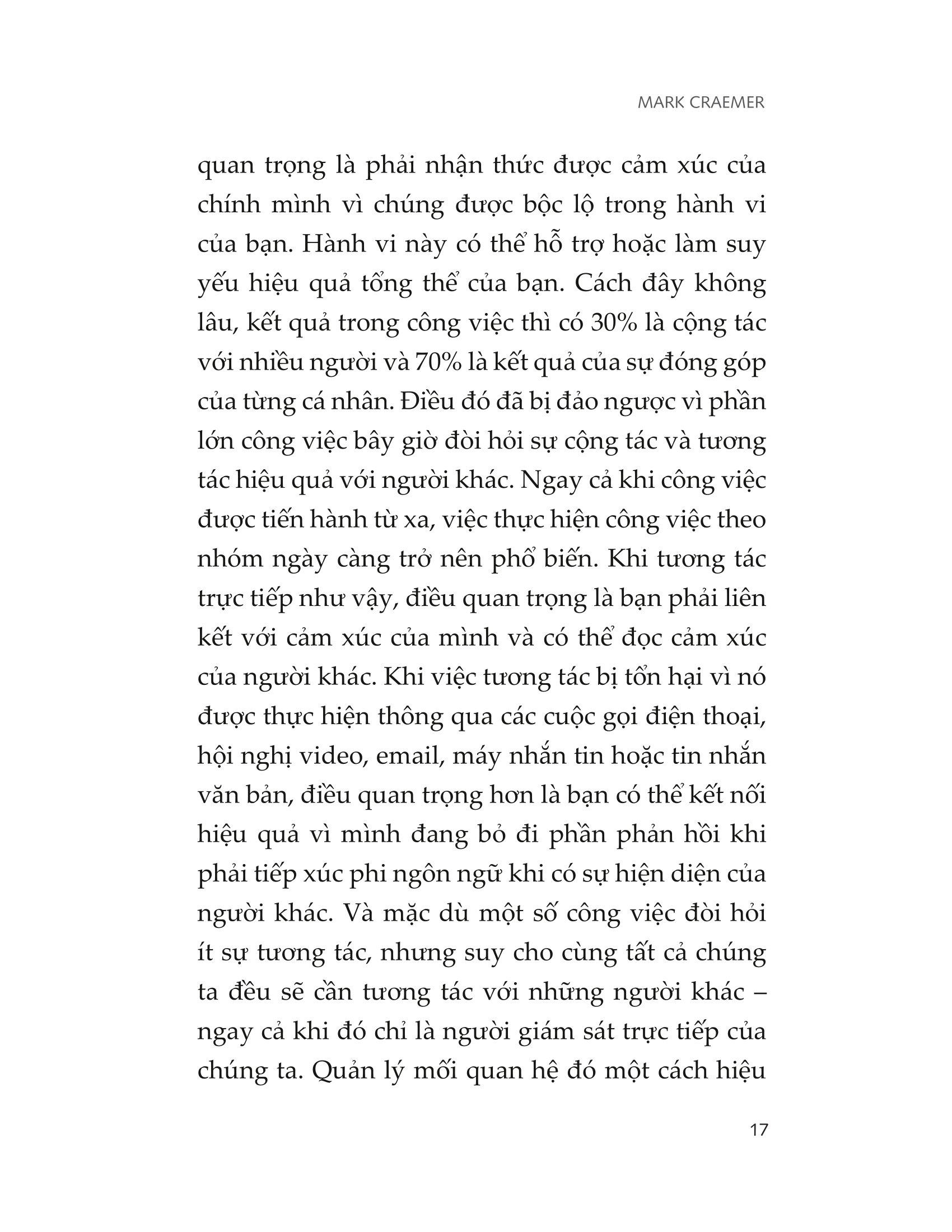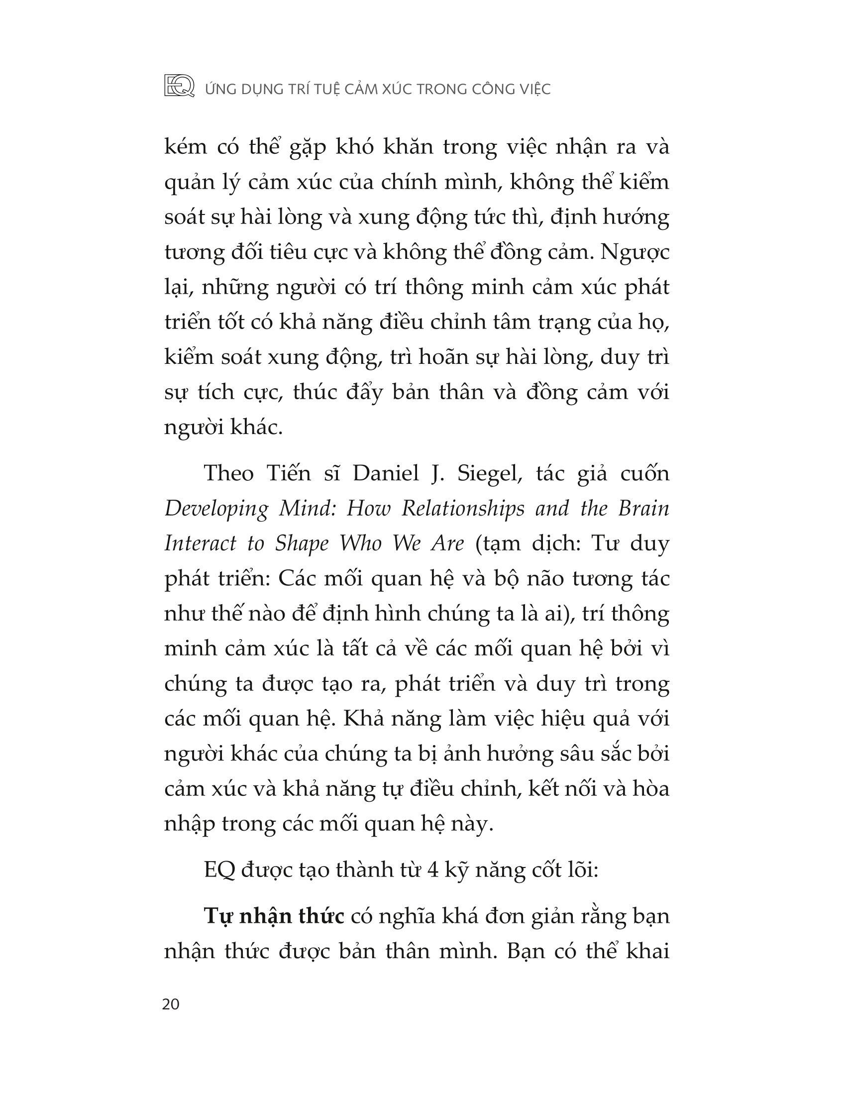 Trí thông minh cảm xúc tối ưu chính là về cách bạn thể hiện trong các mối quan hệ. Điều này có nghĩa là biết bản thân nghĩ gì, cảm thấy gì và muốn gì ở bên trong, và bạn có thể điều chỉnh điều này để thể hiện nó ra bên ngoài như thế nào. Đó cũng là về khả năng khai thác những gì người khác có thể nghĩ, cảm nhận, mong muốn, và sử dụng kiến thức này để giúp bạn định hướng mối quan hệ của mình với họ. Đó là về danh tiếng, sự đáng tin cậy và sự đồng cảm mà bạn thể hiện ra bên ngoài. Đó là về hành vi của bạn khi giao tiếp và cộng tác với người khác, mức độ đưa ra và nhận phản hồi cũng như khả năng quản lý căng thẳng và xung đột của chính mình. Làm việc hiệu quả với những người bị ảnh hưởng sâu sắc bởi cảm xúc của bạn, và đòi hỏi khả năng xoa dịu, kết nối và hòa nhập trong các mối quan hệ. Khi EQ của bạn cao, nó có thể cải thiện đáng kể tính hiệu quả của bản thân với những người khác cũng như giúp chính mình thăng tiến trong sự nghiệp. EQ không thể được phát triển ngoài các tương tác với người khác vì nó thể hiện trong hành vi của bạn và điều này chỉ có thể được phát triển duy trì trong các mối quan hệ. Một phần những gì khám phá trong cuốn sách này sẽ có ích nếu bạn không chọn thực hành các yếu tố EQ lên các mối quan hệ của mình. Điều này có thể yêu cầu bạn phải vượt ra ngoài vùng thoải mái để thay đổi hành vi của mình. Nó sẽ cần sự can đảm và, giống như bất cứ điều gì đáng làm, nó có thể đem lại lợi ích khổng lồ.