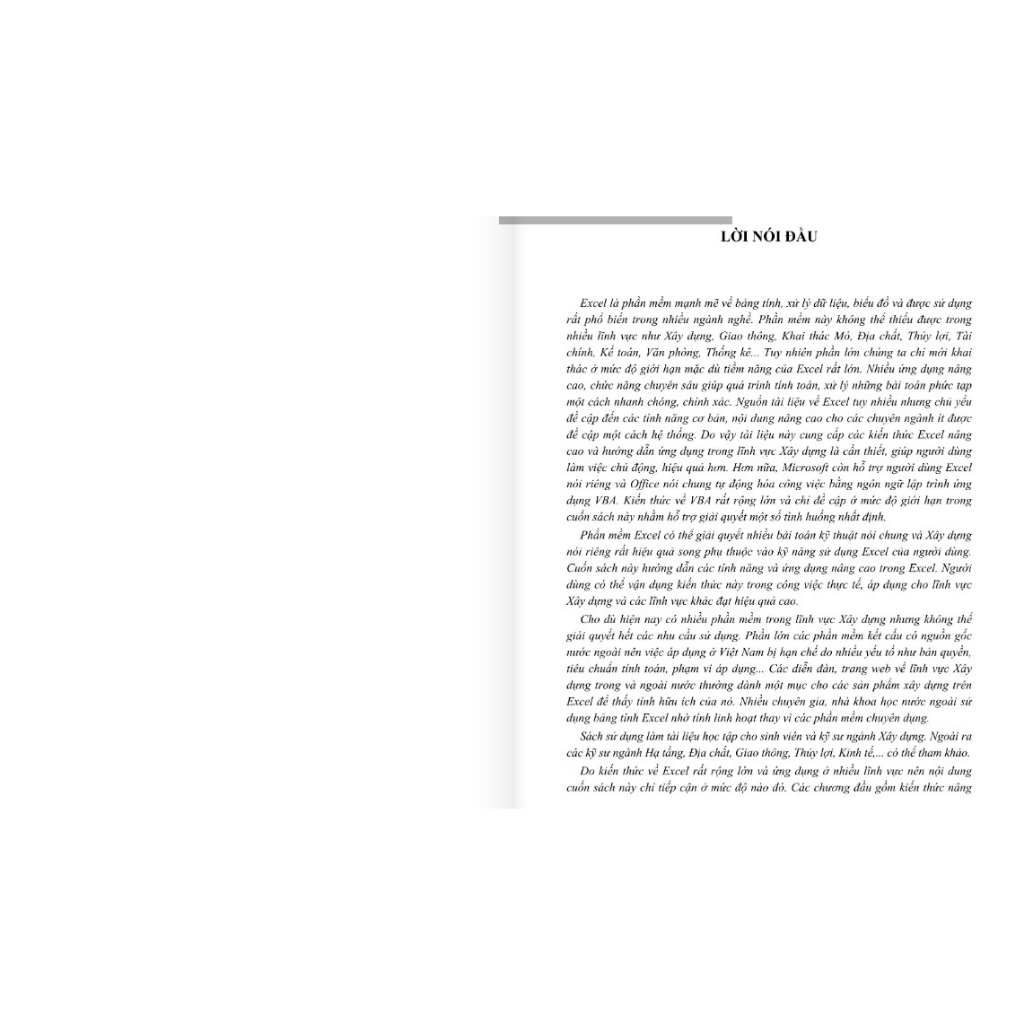 Do kiến thức về Excel rất rộng lớn và ứng dụng ở nhiều lĩnh vực nên nội dung cuốn sách này chỉ tiếp cận ở mức độ nào đó. Các chương đầu gồm kiến thức nâng cao, nội dung cuối đề cập tới một số ứng dụng trong lĩnh vực Xây dựng. Không chỉ với Xây dựng và kỹ thuật, cuốn sách này còn cung cấp kiến thức trong các lĩnh vực khác như văn phòng, nhân sự, quản trị CSDL, kế toá