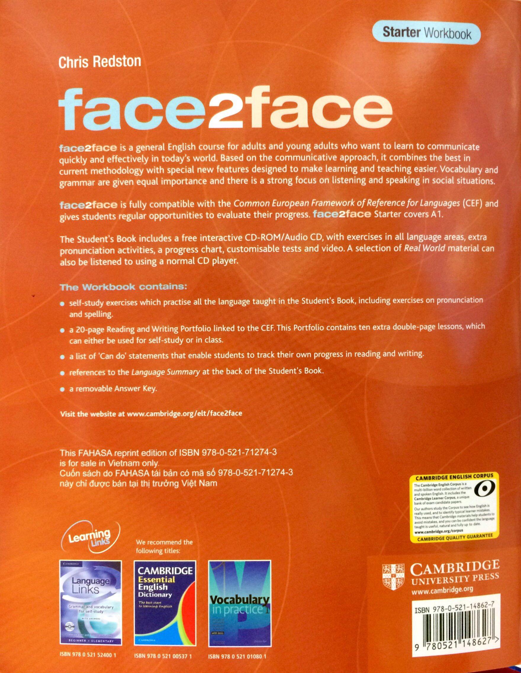 ace2face is a six level general English course for adults and young adults. It goes from Starter level through to Advanced. The Workbook offers additional practise for students of face2face Starter, with self-study exercises which