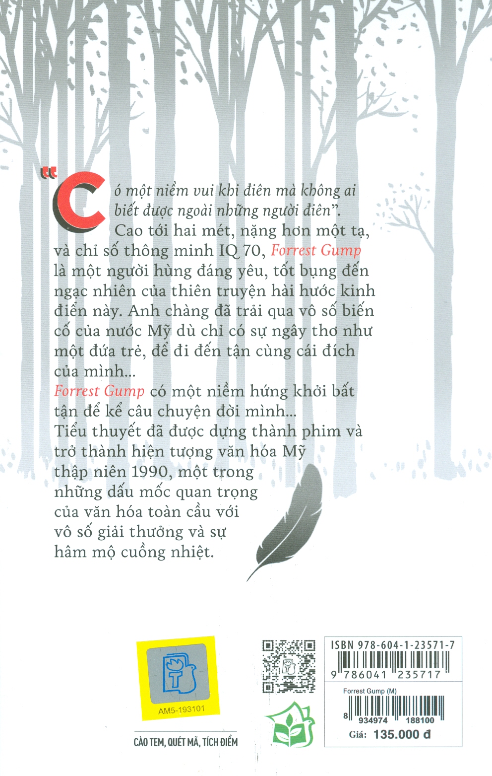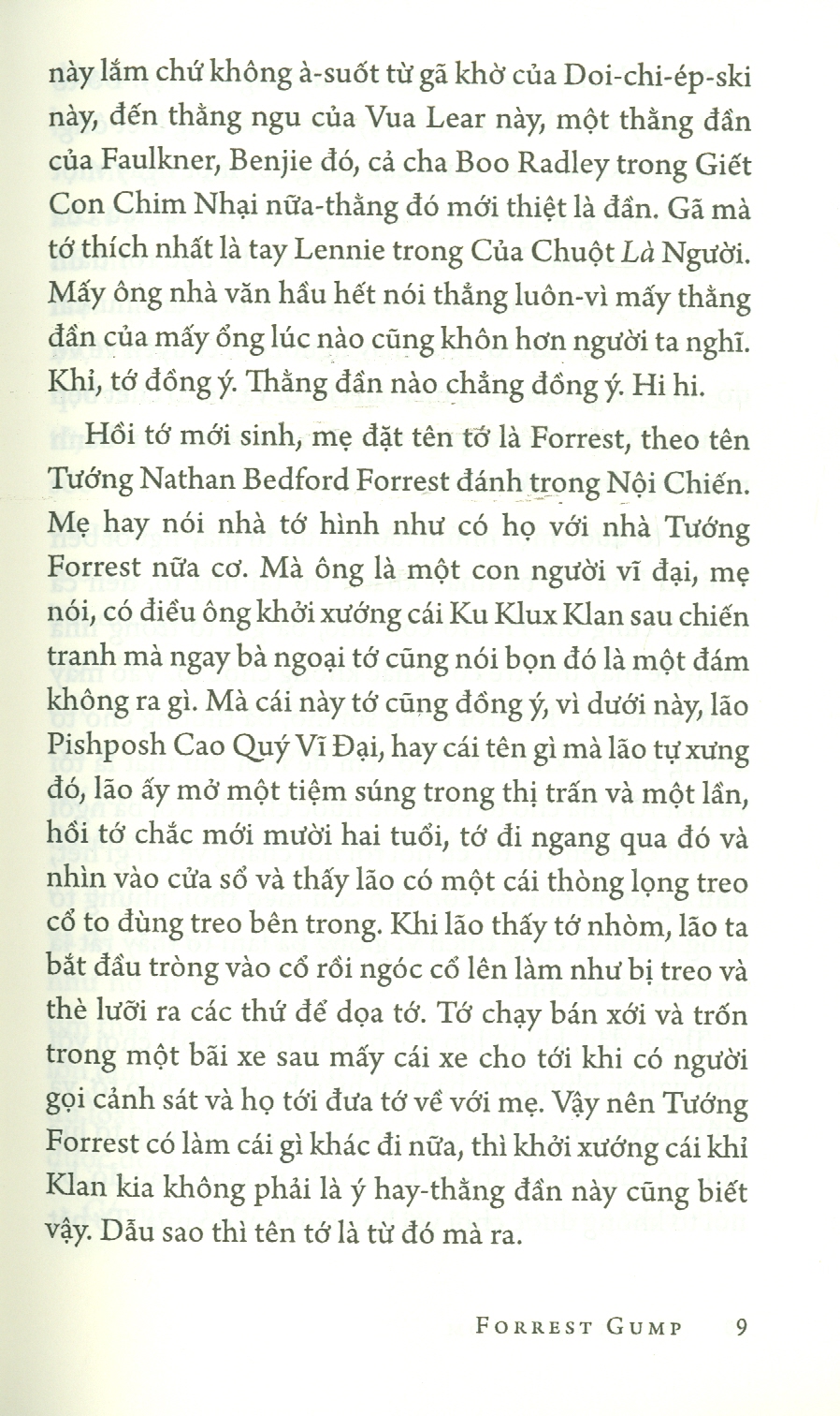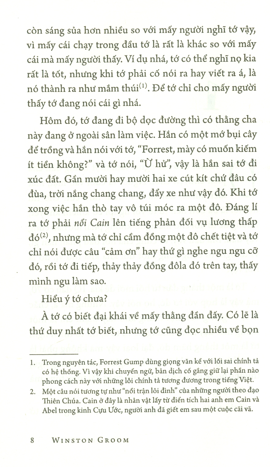 Cuốn sách với lối văn châm biếm ngầm qua góc nhìn ngây thơ của nhân vật chính là đã góp phần đưa Forrest Gump đã trở thành một biểu tượng văn hóa mới của thập niên 1990. Gump là một chàng trai ngốc dễ thương, sẵn sàng cho người khác mà không mong đợi được đền đáp. Đó cũng là giá trị nhân văn nổi bật được chia sẻ nhất quán ở cả tác phẩm văn học và điện ảnh và khiến người đọc cũng như người xem mãi hâm mộ nhân vật này.
