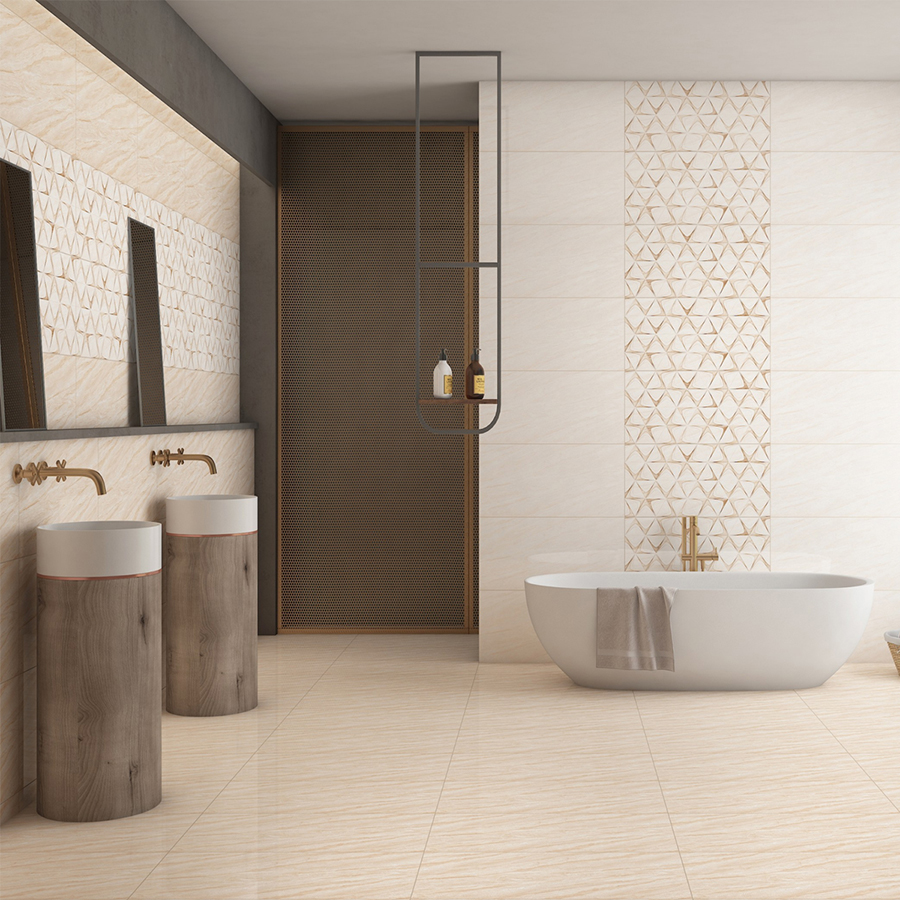 - Gạch có họa tiết đối xứng hình thoi marble giúp tạo nên một thiết kế ốp tường sang trọng, tinh tế và mang hơi hướng hiện đại, phù hợp để trang trí cho các không gian nhà tắm, nhà bếp, phòng khách. Đồng thời, màu kem cũng tạo cảm giác ấm cúng và thư giãn cho những người ở khu vực căn phòng đó.