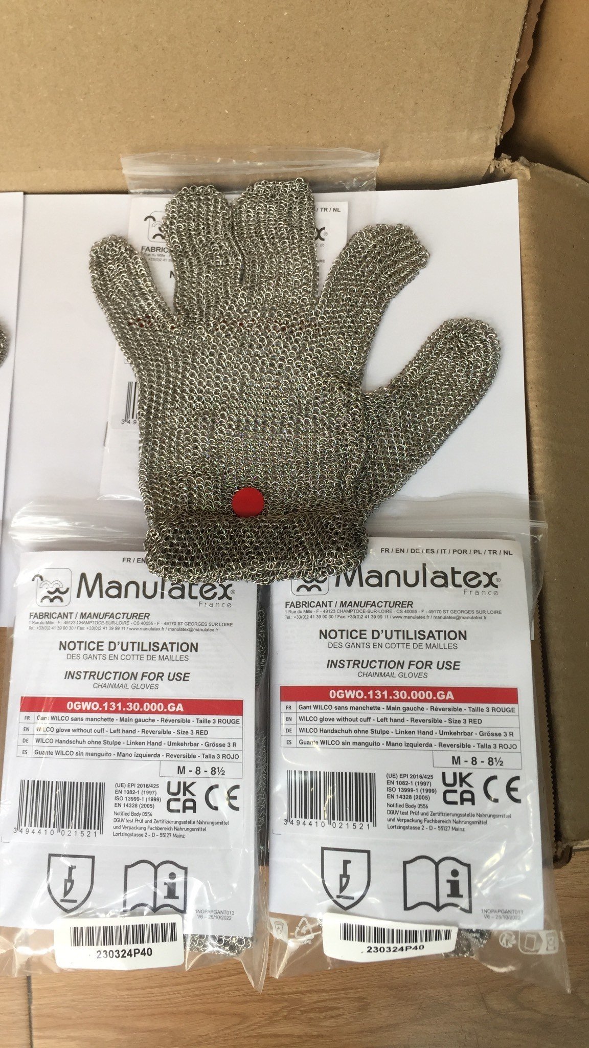 Mua tại TiktokGĂNG TAY CHỐNG CẮT WILCO THƯƠNG HIỆU MANULATEX CỦA PHÁP Chất liệu: thép ko rỉ Hãng: MANULATEX - PHÁP Đơn vị tính: Cái Size : No 2 - trắng S 7-7 1/2 No 3 - đỏ M 8-8 1/2 Tiêu Chuẩn : EN ISO 1082-1, EN 14328, ISO 13999-1 Đặc điểm: Có thể dùng cả hai tay, bằng thép không rỉ, dùng được trong ngành chế biến thực phẩm, công nghiệp, dệt may, hoặc trong trường hợp làm việc với các vật có cạnh sắt nhọn dao, kéo, cư