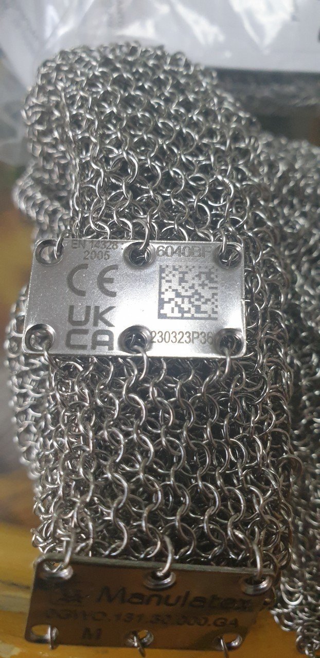 Găng tay chống cắt sợi thép thương hiệu Batex. Được làm từ các sợi thép đan liên kết với nhau