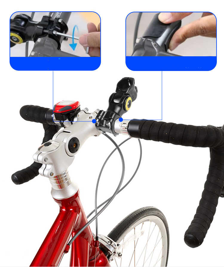- Điều chỉnh thuận tiện: giá ôm cho xe đạp có thể được xoay và điều chỉnh bằng cách xoay lỗ vít, và góc có thể điều chỉnh 120 °. - Đi kèm với kẹp bệ cần điều khiển, bạn có thể cài đặt gậy selfie vào tay lái xe đạp, xe máy hoặc xe đẩy, xe nôi trẻ em trong đường kính 32mm một cách dễ dàng.