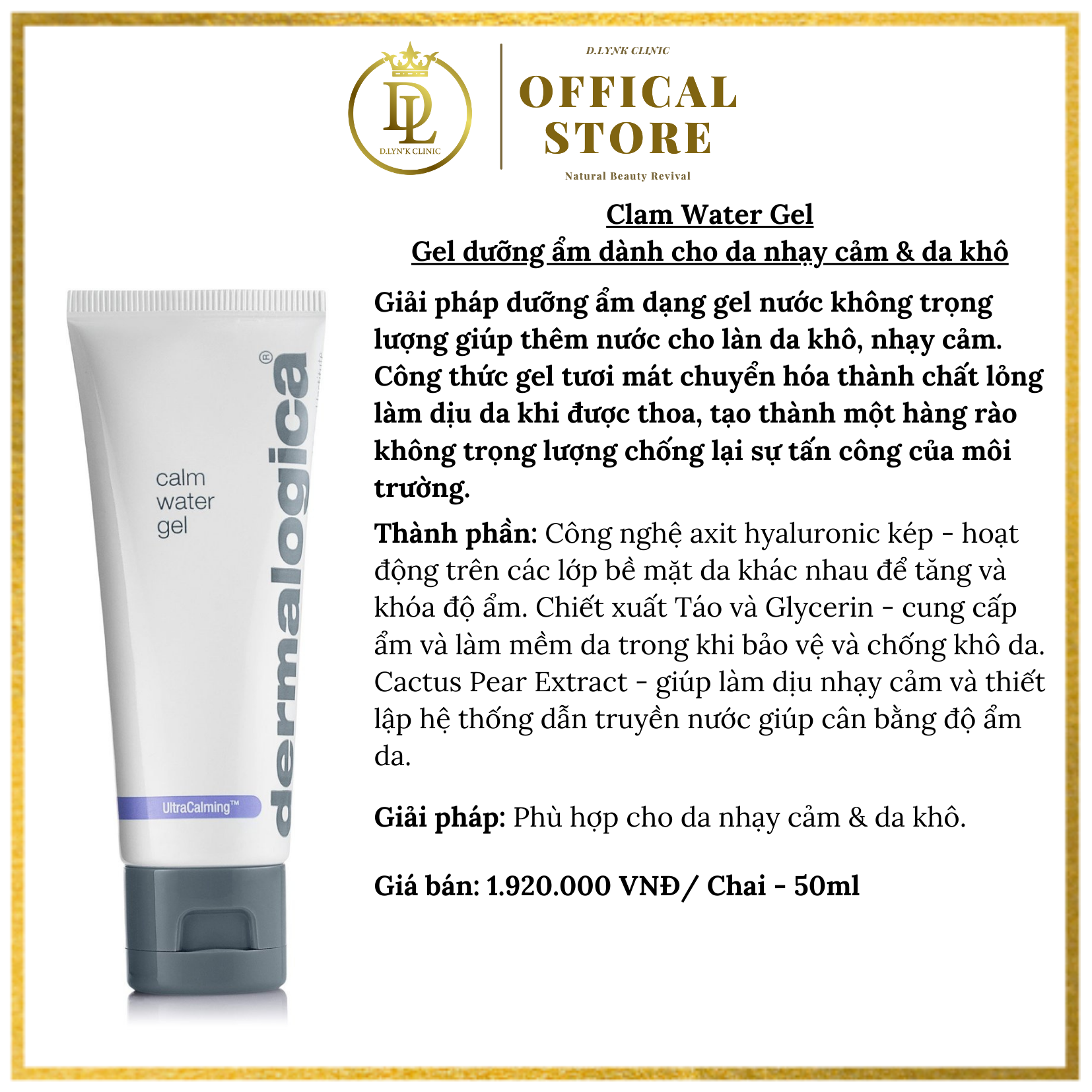 Gel dưỡng ẩm Dermalogica Calm Water Gel 50ml dành cho da nhạy cảm & da khô Gel-nước dưỡng ẩm da nhạy cảm Dermalogica Calm Water Gel là sản phẩm chuyên dùng cho làn da nhạy cảm có công thức từ gel được làm mới hơn là chuyển thành dạng dung dịch chất lỏng dễ thấm thấu vào sâu bên trong da hơn. Từ đó đưa lại tác dụng hiệu quả nhanh chóng làm dịu da cho làn da được mềm mại, mịn màng và còn tạo thành một lớp màng bảo vệ, chống lại các sự tấn công của môi trường. Bên cạnh đó với công nghệ axit hyaluronic kép hoạt động trong các lớp bề mặt da khác nhau giúp tăng cường và khóa độ ẩm. THÔNG TIN SẢN PHẨM