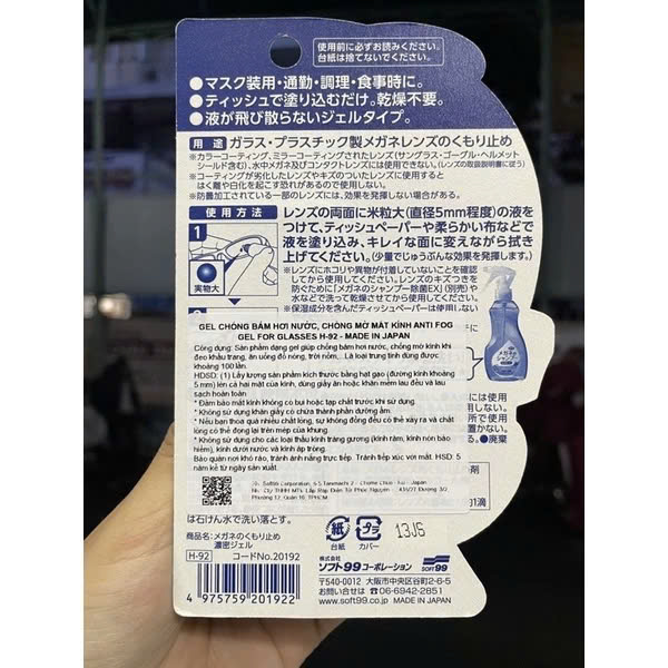 Gel chống sương mù dành cho kính có thể làm tan sương mù khi đeo mắt kính. Có thể sử dụng kính ngay sau khi bôi gel mà không cần phải chờ khô.
