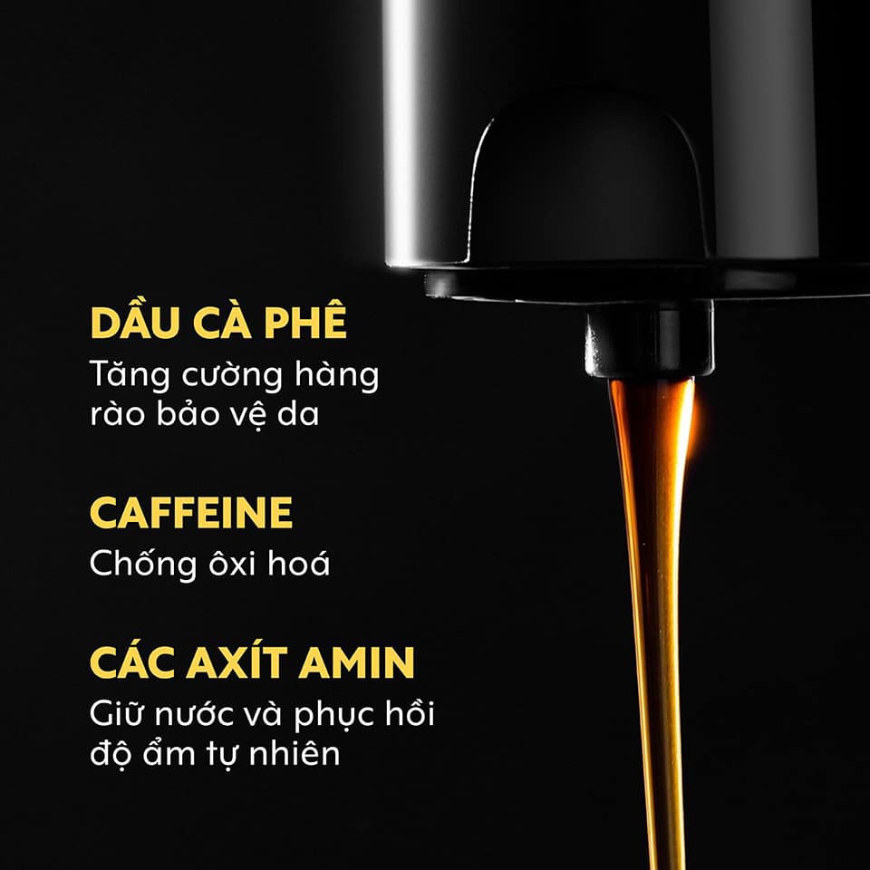 • Dầu cà phê: Đây là loại dầu hoạt tính được trích lý từ 100% bã cà phê Arabica, chúng có sự kết hợp độc đáo giữa axit palmitic và axit linoleic mang lại khả năng thẩm thấu tuyệt vời, từ đó hỗ trợ quá trình giữ nước cho da, tăng cường sức mạ.nh của hà.ng rào bả.o vệ da, giúp da trở nên khoẻ khoắn, mềm mại và rạng rỡ hơn. Ngoài ra, trong dầu cà phê hoạt tính còn chứa Tocopherols (vitamin E tự nhiên) giúp tăng cường chố.ng ôx.i hóa bằng cách tạo ra Nrf2 và giảm sản sinh các gốc tự do.