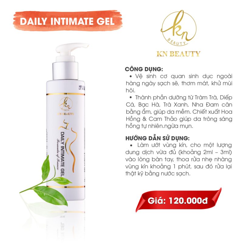Mua tại TiktokGEL VỆ SINH PHỤ NỮ HÀNG NGÀY KN BEAUTY Gel vệ sinh nữ hàng ngày KN Beauty DAILY INTIMATE GEL được bào chế theo Công thức độc quyền CỦA PHÁP với thành phản dưỡng có nguồn gốc thiên nhiên giúp vùng kín được làm sạch dịu nhẹ, an toàn và hiệu quả. Chăm sóc nâng niu làn da mong manh nhạy cảm luôn mềm mại, mịn màng và sáng hồng tự nhiên. Thành phần Gel vệ sinh phụ nữ hàng ngày KN Beauty Chiết xuất từ các loại thảo dược quý phối hợp chăm dưỡng và bảo vệ tối ưu nhờ bởi các hoạt tính đặc biệt vốn có tự nhiên trong thành phần dưỡng chất.