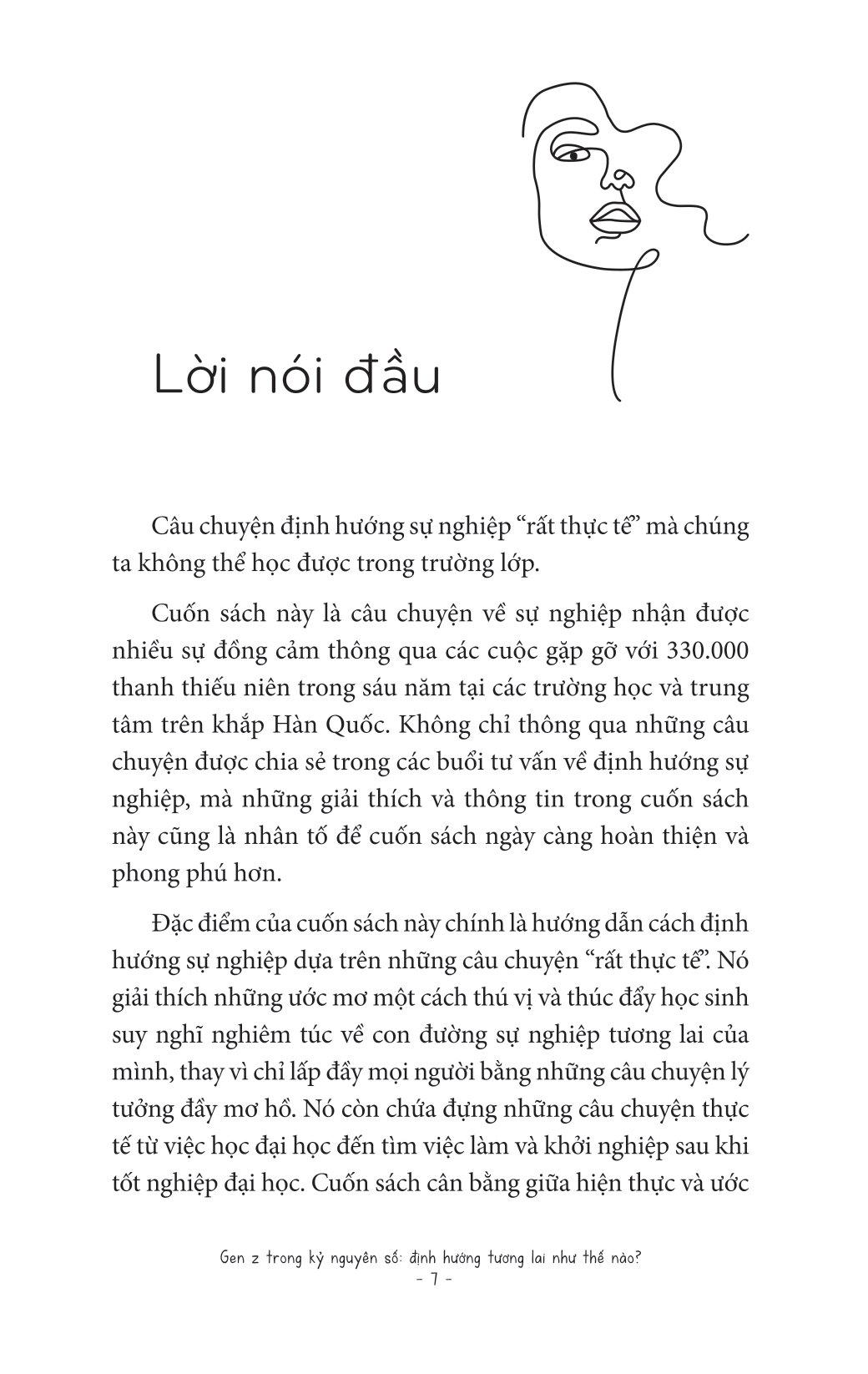 Trong cuốn sách Gen Z trong kỷ nguyên số: Định hướng tương lai như thế nào?, tác giả Yun Kyu Hoon thông qua những cuộc nói chuyện với hơn 330.000 thanh thiếu niên tại các trường trung học sẽ chỉ cho bạn thấy cách làm thế nào để vạch ra một con đường sự nghiệp tương lai đúng đắn dù bạn đã có đam mê hay chưa tìm ra. Việc định hướng này rất quan trọng, đặc biệt trong tình hình cả thế giới đang đối mặt với đại dịch covid và sự thay đổi chóng mặt do nền công nghiệp 4.0 mang lại. Những tư duy nào nên có, những nghề nghiệp nào nên được ưu tiên, những kỹ năng nào cần đào sâất cả đều đang chờ bạn lật mở cuốn sách này để khám phá.