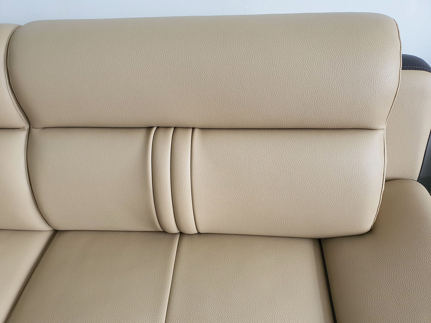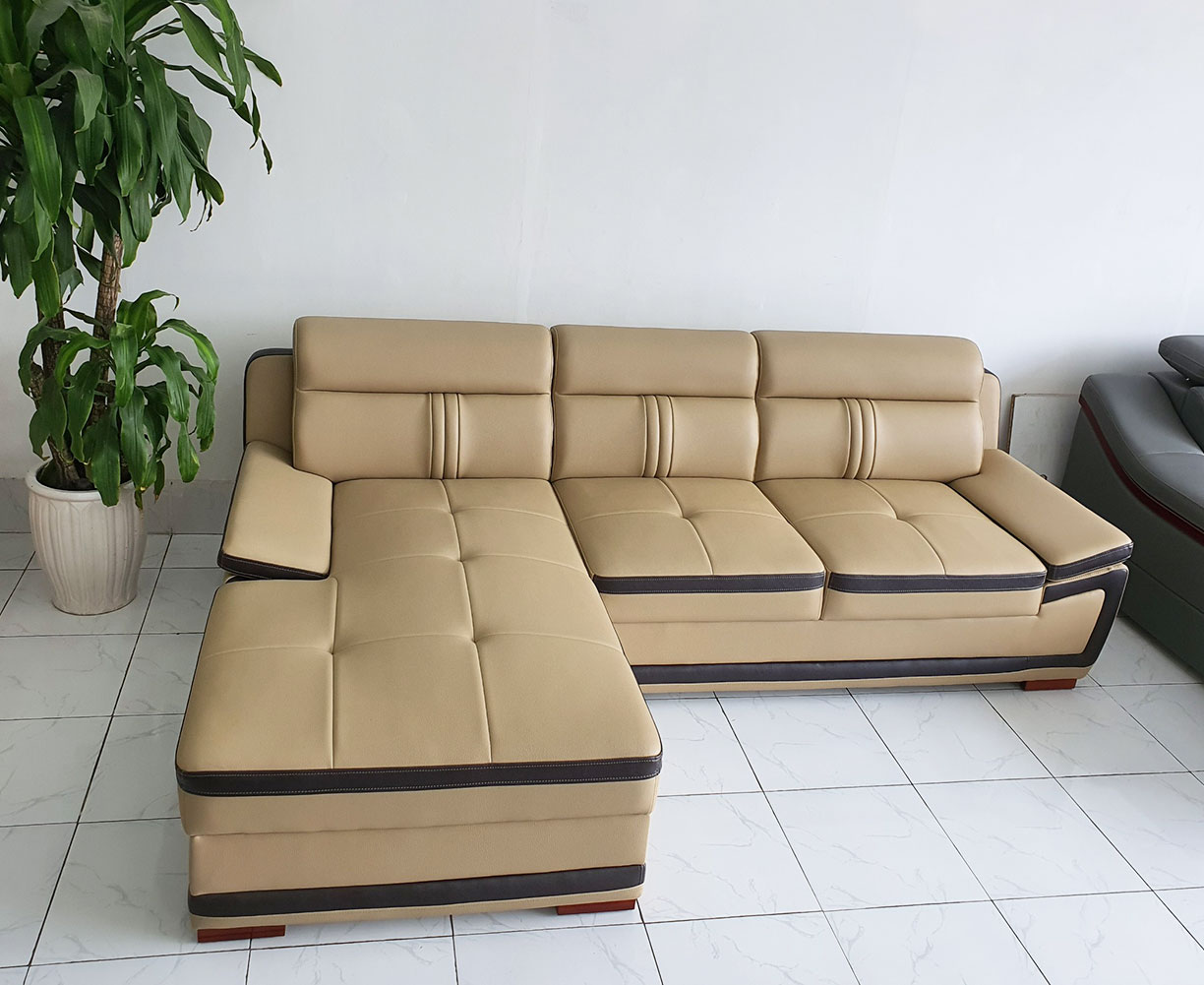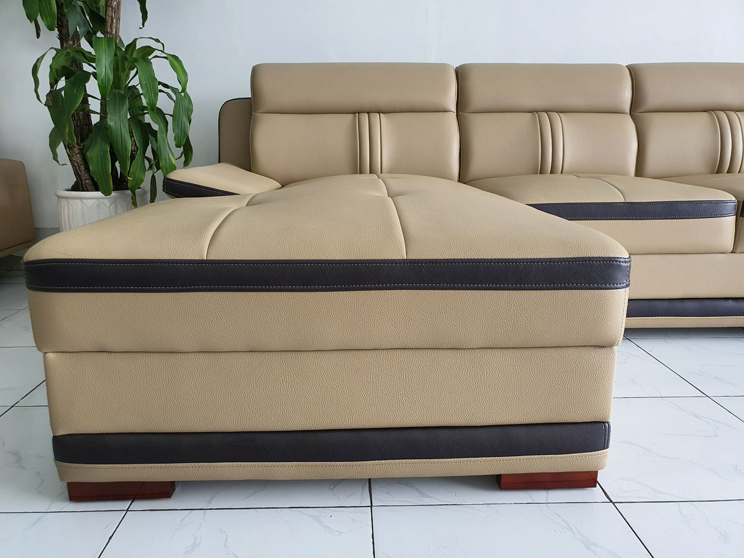 Có được một bộ ghế đẹp cho phòng khách là điều ai cũng mong muốn. Để đáp ứng nhu cầu của khách hàng chúng tôi đã cho ra đời bộ sofa với thiết kế mới nhất, mang đậm hiện đại, đẹp mắt. Bộ sofa này màu kem có viền màu nâu đen, lưng ghế có 2 đường may ở giữa chạy dọc tạo điểm nhấn, mặt ngồi của ghế được may rút nút nên khi nằm sẽ đỡ bị nóng hơn. Ghế sofa da công nghiệp cao cấp được thiết kế đơn giản theo góc nhà tạo thành hình chữ L giúp tiết kiệm diện tích và tận dụng được các góc chết của căn phòng. Tiện lợi cho cả việc tiếp khách lẫn thư giãn, đọc sách, xem phim,