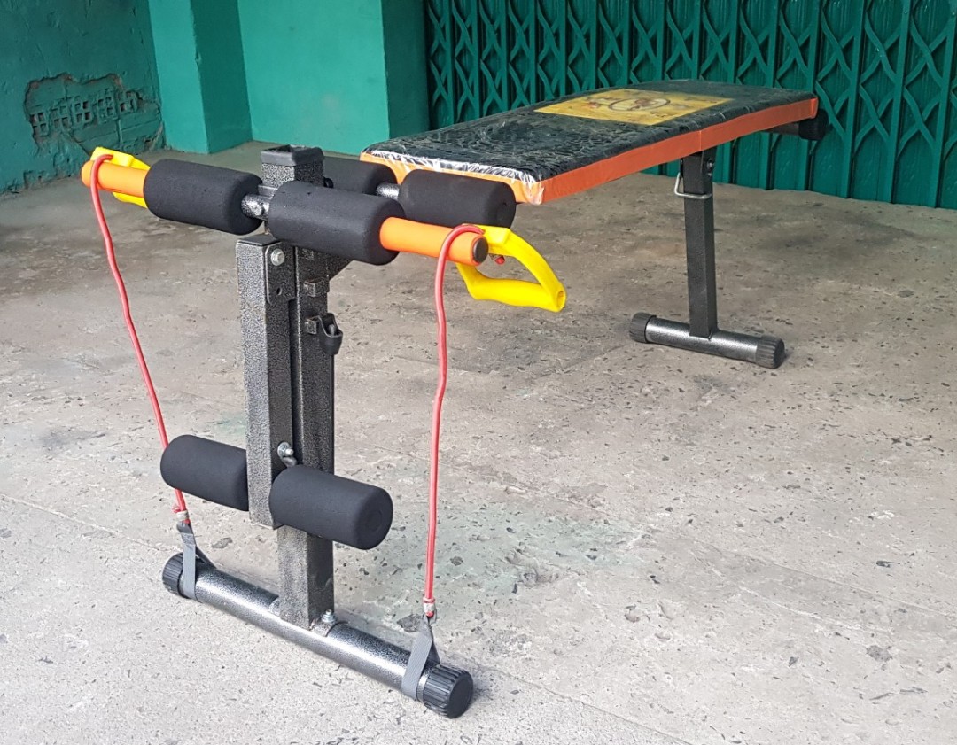HƯỚNG DẪN SỬ DỤNG 1/ Tập bụng trên: Ngồi vào ghế như hình móc 2 chân vào đệm cao su, nằm thẳng người xuống, hít hơi vào dùng sức nâng người lên lúc này thở ra. Ngồi như tư thế trên, khi xuống kết hợp vặn người sang trái (hoặc phải) để tập eo. 2/ Tập bụng dươi: Nằm ngửa, 2 tay bám vào đệm cao su, 2 chân duỗi thẳng nâng lên cao, thóp bụng, hít hơi vào lại rồi hạ xuống từ từ không chạm đất, lúc này thở ra . Rồi lập lại như trên nhiều lần. 3/ Tập vai tay trước: Ngồi móc chân vào đệm cao su, hai tay nắm đầu dây, kéo căng lực dây ra 2 bên, lập đi lập lại nhiều lần. 4/ Tập hít đât: Hai tay nắm vào đầu mút. Người ngã về hướng ghê, hai khuỷu tay gấp lại đồng thời hít vào. Dùng lực cổ tay, cánh tay, đẩy thân người nhô lên, thở ra. Lập lại nhiều lần. 5/ Tập ngực trên Ghế với tạ: Nằm ngữa trên ghế: 2 chân móc vào cao su, 2 tay nâng tạ lên cao, tập ngực và tay sau. 6/ Tập cơ lưng tư thế nằm sấp: Nằm sấp 2 chân cài vào đệm cao su, 2 tay đặt sau gáy, nâng người lên. Tập cơ lưng khòe dẻo dai.