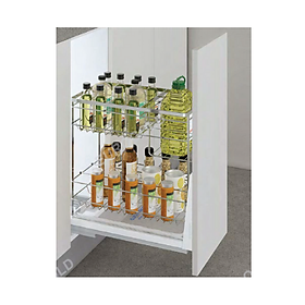 Giá đa năng để giao thớt, chai lọ, gia vị Chất liệu: Inox 304 dạng nan tròn Phiên bản bắt cánh ngăn kéo và mở cánh Ray âm giảm chấn Angas Độ rộng cánh: 300mm