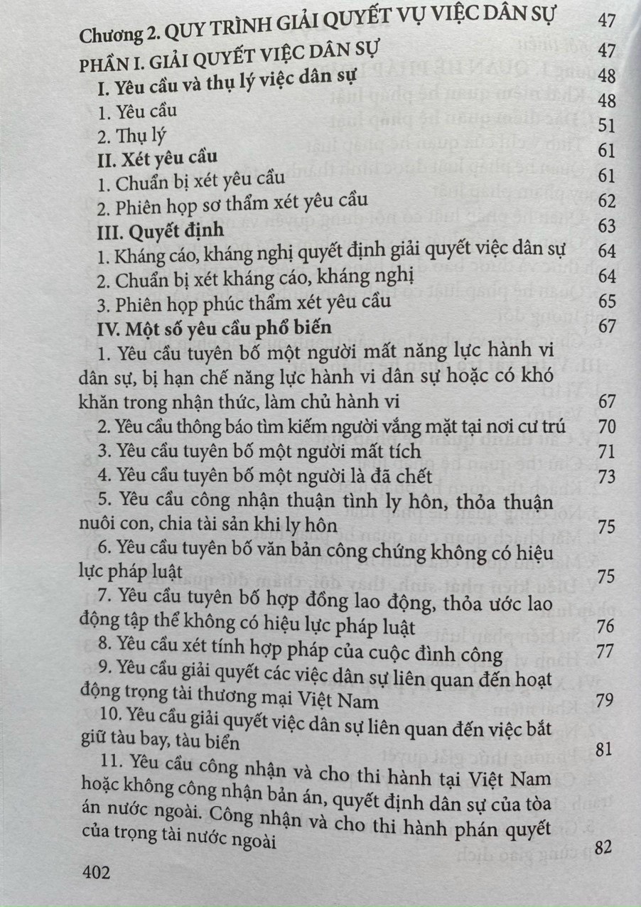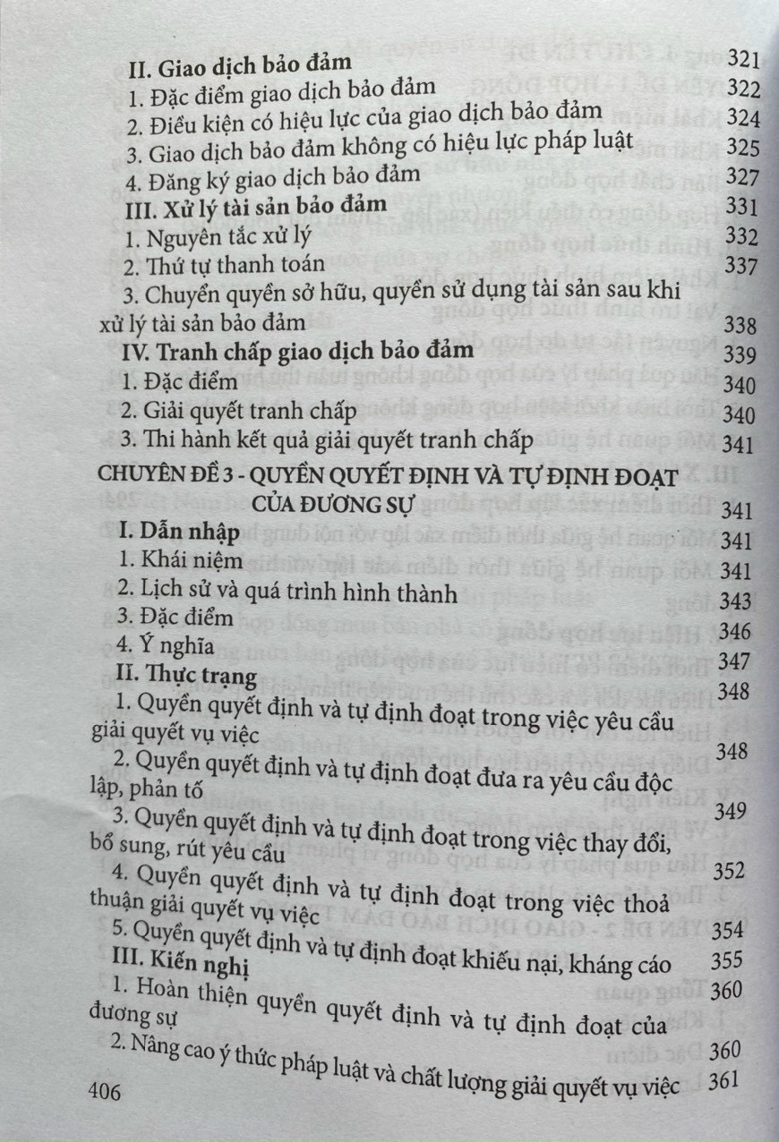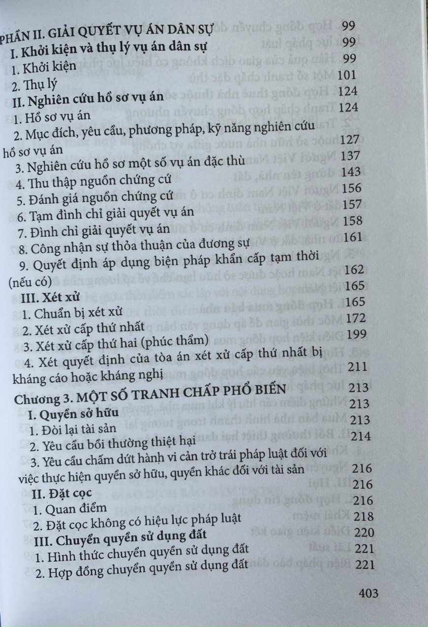 Giải quyết vụ việc dân sự NXB: Lao Động Tác giả: TS. Nguyễn Quang Hiền Sách khổ: 14.5x20.5cm Số trang: 406 LỜI GIỚI THIỆU Pháp luật dân sự là công cụ pháp luật hữu hiệu nhằm thúc đẩy các giao dịch dân sự, tạo môi trường thuận lợi cho sự phát triển kinh tế xã hội, đặc biệt là trong việc xử lý các quan hệ pháp luật dân sự tranh chấp. Trong thực tiễn thụ lý và xét xử hiện nay cho thấy, việc giải quyết quan hệ pháp luật dân sự tranh chấp thường gặp một số khó khăn bởi do chưa có quy định của pháp luật hoặc mới có luật khung, chưa có tính định lượng cụ thể, tính ổn định không cao, các quy phạm pháp luật còn mâu thuẫn, chồng chéo và vẫn còn có những sai sót. Bên cạnh đó, Bộ luật Tố tụng dân sự năm 2015 còn quy định tòa án không được từ chối giải quyết vụ việc dân sự vì lý do chưa có điều luật để áp dụng, tòa án phải áp dụng tập quán, áp dụng tương tự pháp luật, áp dụng các nguyên tắc cơ bản của pháp luật dân sự, án lệ, lẽ công bằng để giải quyết vụ việc. Do đó, việc nghiên cứu vấn đề giải quyết quan hệ pháp luật dân sự tranh chấp một cách có hệ thống và toàn diện để làm sâu sắc thêm các vấn đề lý luận, thực sự đang là chủ đề thu hút, chú ý của các nhà nghiên cứu cũng như những người hoạt động thực tiễn trong quá trình áp dụng pháp luật của giai đoạn cải cách tư pháp và xây dựng nhà nước pháp quyền ở nước ta hiện nay. Cuốn sách “Giải quyết vụ việc dân sự” đề cập và lý giải ở mức độ nhất định về những vấn đề nêu trên, cung cấp những kiến thức xã hội, pháp luật và thực tiễn, đề cập nhiều vấn đề mới về cách tiếp cận và quan niệm, cơ sở, tính chất và phạm vi. Tuy nhiên, việc giải quyết quan hệ pháp luật dân sự tranh chấp là vấn đề rộng lớn, phức tạp, đa dạng và nhạy cảm, cho nên nhiều vấn đề cần được tiếp tục nghiên cứu, trao đổi và tranh biện trên diễn đàn khoa học pháp luật. Hy vọng rằng, cuốn sách sẽ đáp ứng được phần nào nhu cầu của bạn đọc và sẽ là tài liệu tham khảo dành cho những người quan tâm. Tuy đã cố gắng, nhưng cuốn sách vẫn không tránh khỏi một số hạn chế và những thiếu sót nhất định, mọi trách nhiệm thuộc về tác giả. Xuất phát từ quan điểm không quá cầu toàn và cố gắng tối đa để tránh những khiếm khuyết, chắc chắn rằng, với sự cảm thông và những ý kiến đóng góp, phê bình của bạn đọc cuốn sách sẽ được hoàn thiện hơn trong lần tái bản sau. MỤC LỤC Trang Chương 1 QUAN HỆ PHÁP LUẬT