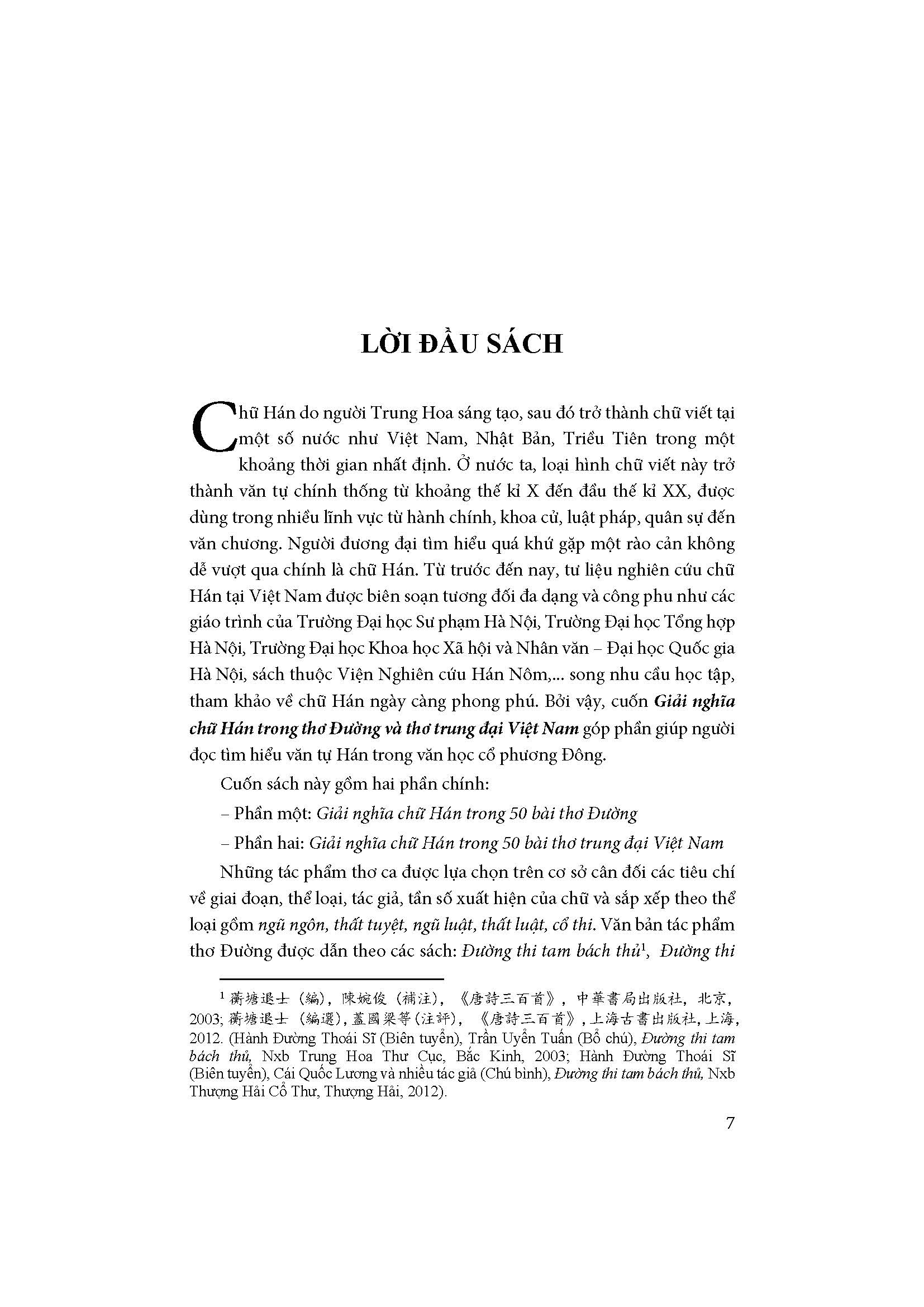 Cuốn Giải nghĩa chữ Hán trong thơ Đường và thơ trung đại Việt Nam được biên soạn hướng tới việc góp phần giúp bạn đọc, người học tìm hiểu văn tự Hán trong văn học