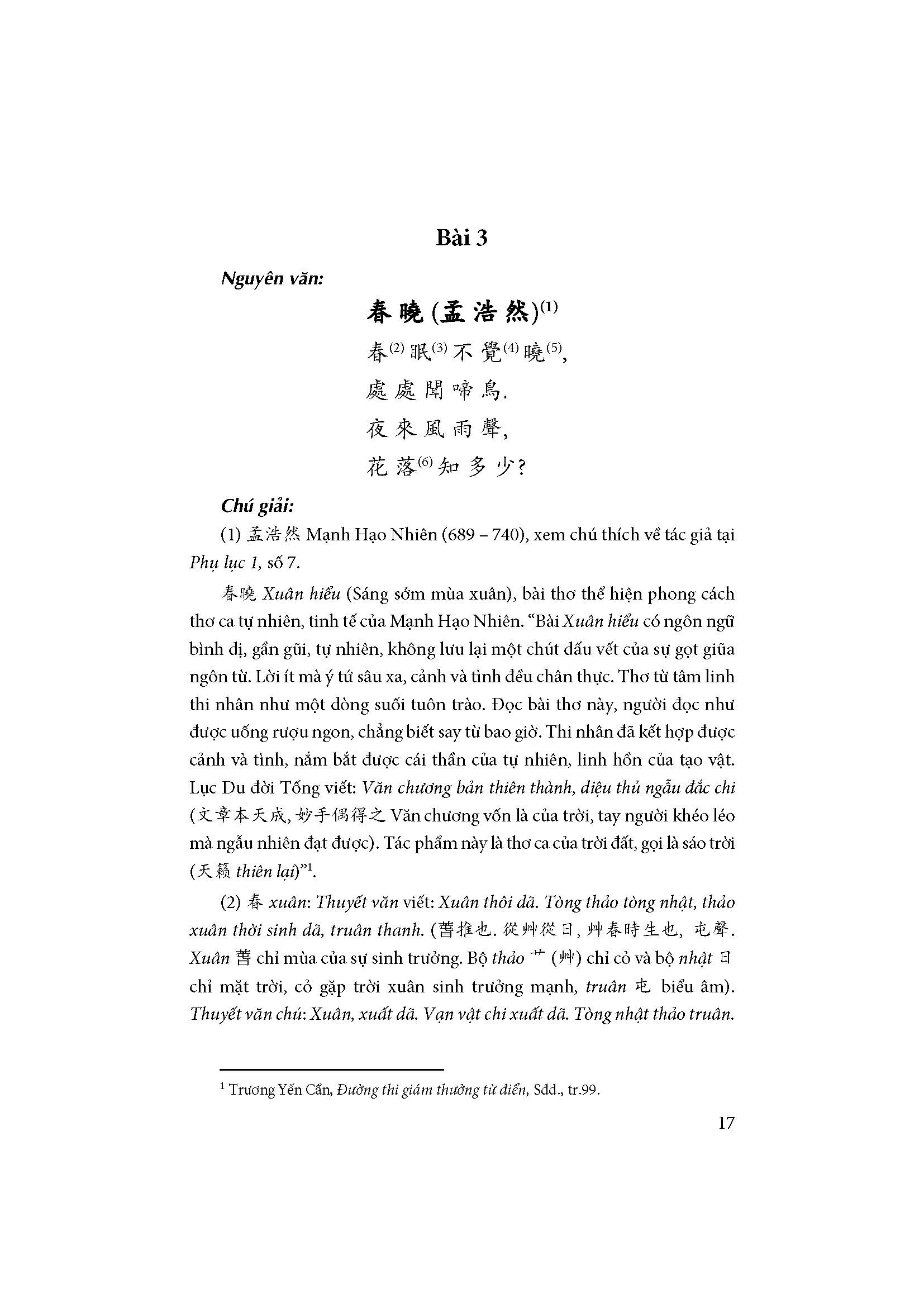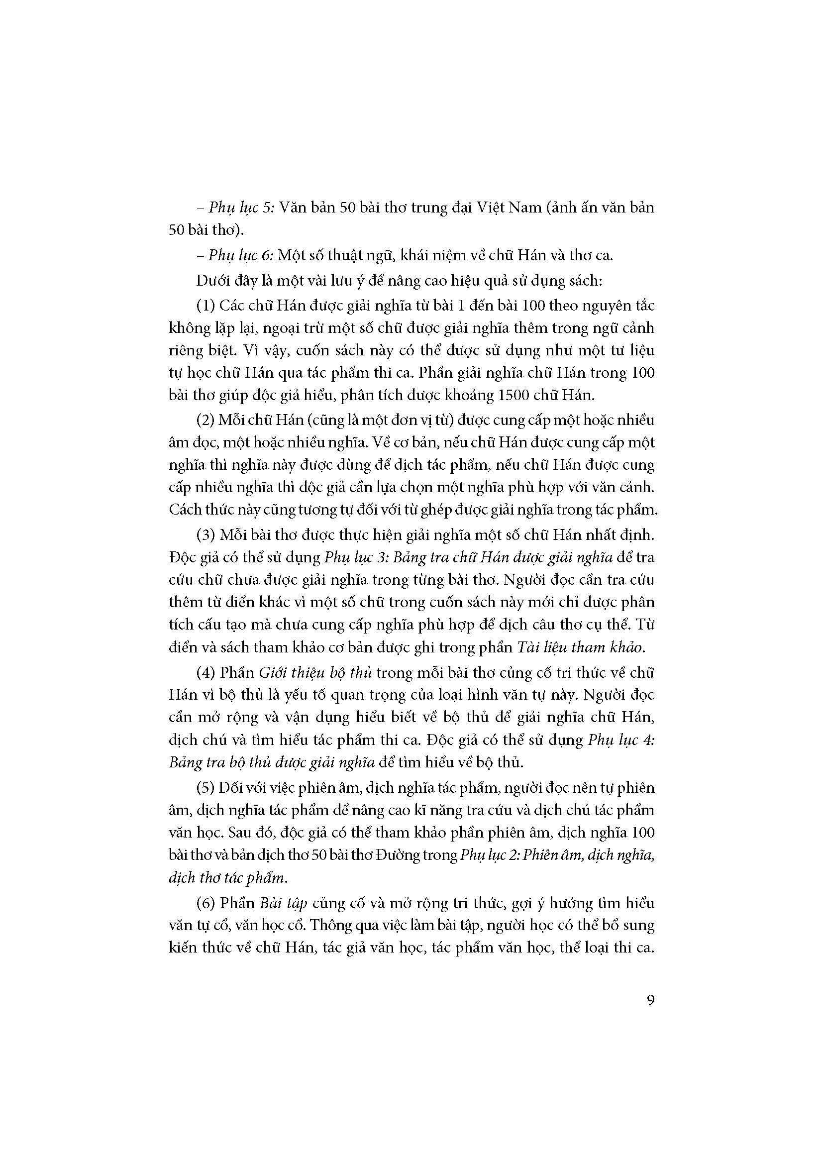 Bên cạnh đó, các Phụ lục trong cuốn sách này sẽ giúp bạn đọc tra cứu thêm các chữ Hán chưa được giải nghĩa trong từng bài thơ; tìm hiểu thêm về bộ thủ cũng như phần phiên âm, dịch nghĩa 100 bài thơ và bản dịch 50 bài thơ Đường; chỉ dẫn cách tra cứu khoảng 1500 chữ Hán được giải nghĩa trong cuốn sách, mỗi chữ Hán xuất hiện trong một ngữ cảnh cụ thể của tác phẩm.