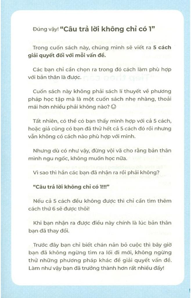 - Mình đã giảm được số lỗi bất cẩn một cách đáng ngạc nhiên. Điểm kiểm tra cũng tăng. - (Nữ, lớp 7) Cuốn sách “Giải quyết những trở ngại trong học tập” được viết bởi tác giả là những sinh viên đang theo học đại học, bật mí cho các bạn học sinh trung học cơ sở và trung học phổ thông cách giải quyết 40 vấn đề thường gặp trong học tập và cuộc sống thường ngày, từ chuyện thi cử, phương pháp học, cho đến chuyện “yêu thầm nhớ trộm” hay định hướng tương lai. Chắc chắn các bạn trẻ sẽ tìm được nhiều điều lí thú và bổ ích. Cuốn sách đã bán 60.000 bản ở Nhật Bản. SAU KHI ĐỌC XONG CUỐN SÁCH, CÁC BẠN SẼ THAY ĐỔI THẾ NÀO???