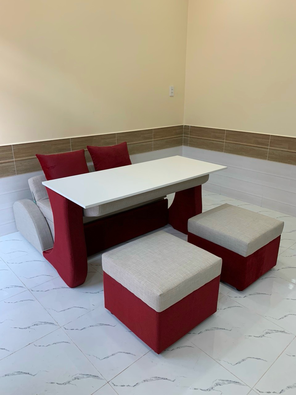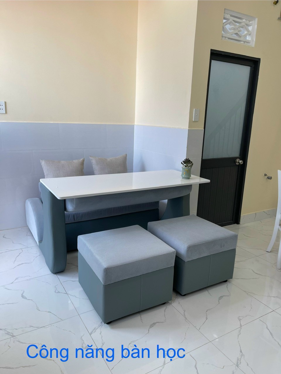 Giới thiệu mẫu Sofa 3 Chức Năng tối ưu không gian sử dụng và tiện ích cho khách hàng sử dụng.   Bàn học hoặc làm việc có kích thước ngang x rộng x cao : 140cm x 60cm x 75cm   Bàn được thiết kế theo tiêu chuẩn phù hợp với người lớn và trẻ em để học và làm việc Bên dưới có ngăng bàn nhỏ tiện cho các bé để tập sách hoặc vận dụng tạm thời.   Mặt bàn làm bằng ván công nghiệp MDF 18mm trắng bóng.   Ngoài ra Bạn hoàn toàn có thể đón tiếp bạn bè ăn uống trò chuyện từ 4 đến 6 người.   Giường ngủ êm ái được sử dụng từ khối mút dầy 12cm, có kích thước: 100cm x 165cm vừa cho 1 người lớn hoặc 2 trẻ nhỏ.   Chiếc giường kết hợp cùng 2 ghế đôn 50cmx50cm tạo diện tích sử dụng tối ưu.   Sofa 3 chức năng mang lại sự êm ái thoải mái cho 2 người ngồi xem ti   Sản phẩm được bảo hành 12 tháng cho phần khung sườn và đệm mút, đổi mới trong tuần đầu.