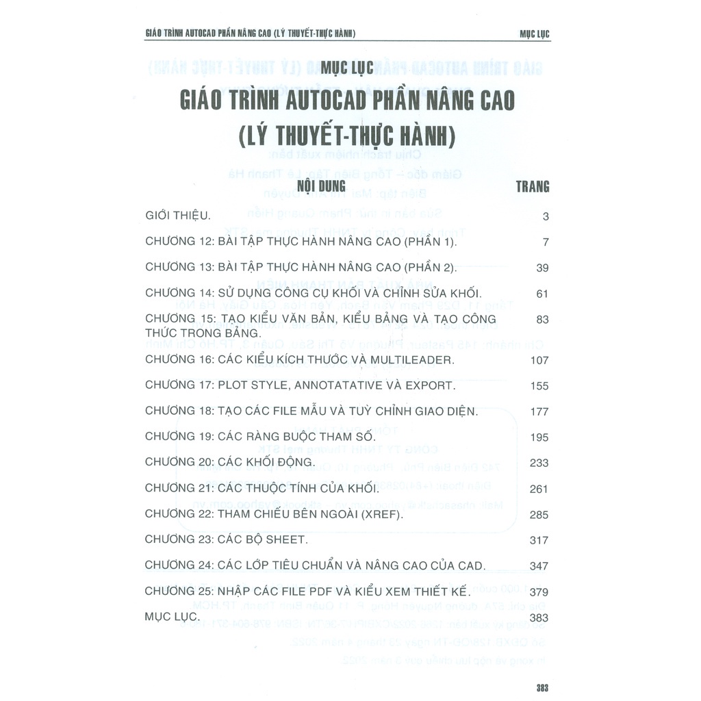 Nội dung Giáo trình AutoCad Phần Nâng Cao với 13 chương và phần phụ lục giới thiệu Bài tập thực hành: Bài tập thực hành nâng cao; Sử dụng công cụ khối và chỉnh sửa khối; Tạo các kiểu văn bản, kiểu bảng và tạo công thức trong bảng; Các kiểu kích thước và Multileder; Plot Styles, Annotatative và Export; Tạo các file mẫu và tùy chỉnh giao diện; Các ràng buộc tham số; Các khối động; Tham chiếu bên ngoài; Các bộ S"