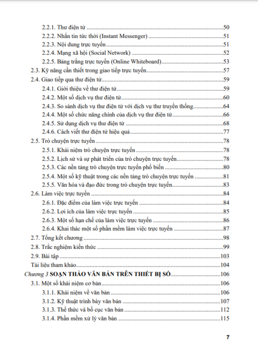 Chương 2: Giao tiếp trực tuyến, trình bày các kiến thức sâu về giao tiếp trực tuyến, bao gồm các hình thức giao tiếp như thư điện tử, tin nhắn tức thì và mạng xã hội. Đồng thời, Chương 2 phân tích các kỹ thuật và công nghệ hỗ trợ giao tiếp trực tuyến hiệu quả, nhấn mạnh vào văn hóa và đạo đức số. Chương này cũng mở rộng sang làm việc trực tuyến, phân tích lợi ích và thách thức của việc làm việc trực tuyến.