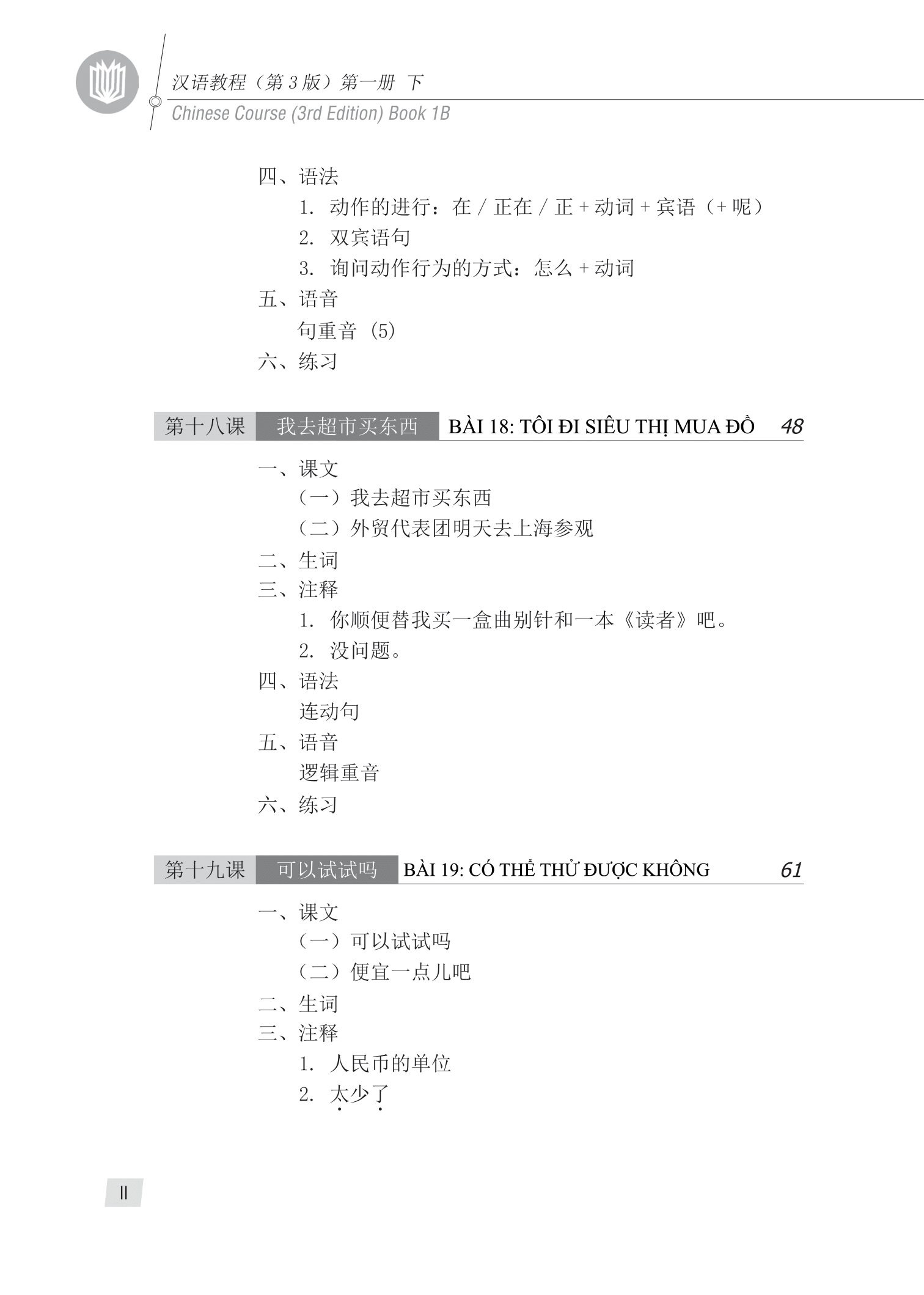 Các bài học trong “Giáo trình Hán ngữ 2 Tập 1 Quyển hạ phiên bản 3″ được Mcbooks thiết kế như sau: 1. Bài đọc, 2. Từ mới, 3. Chú thích, 4. Ngữ âm, Ngữ pháp, 5. Luyện tập