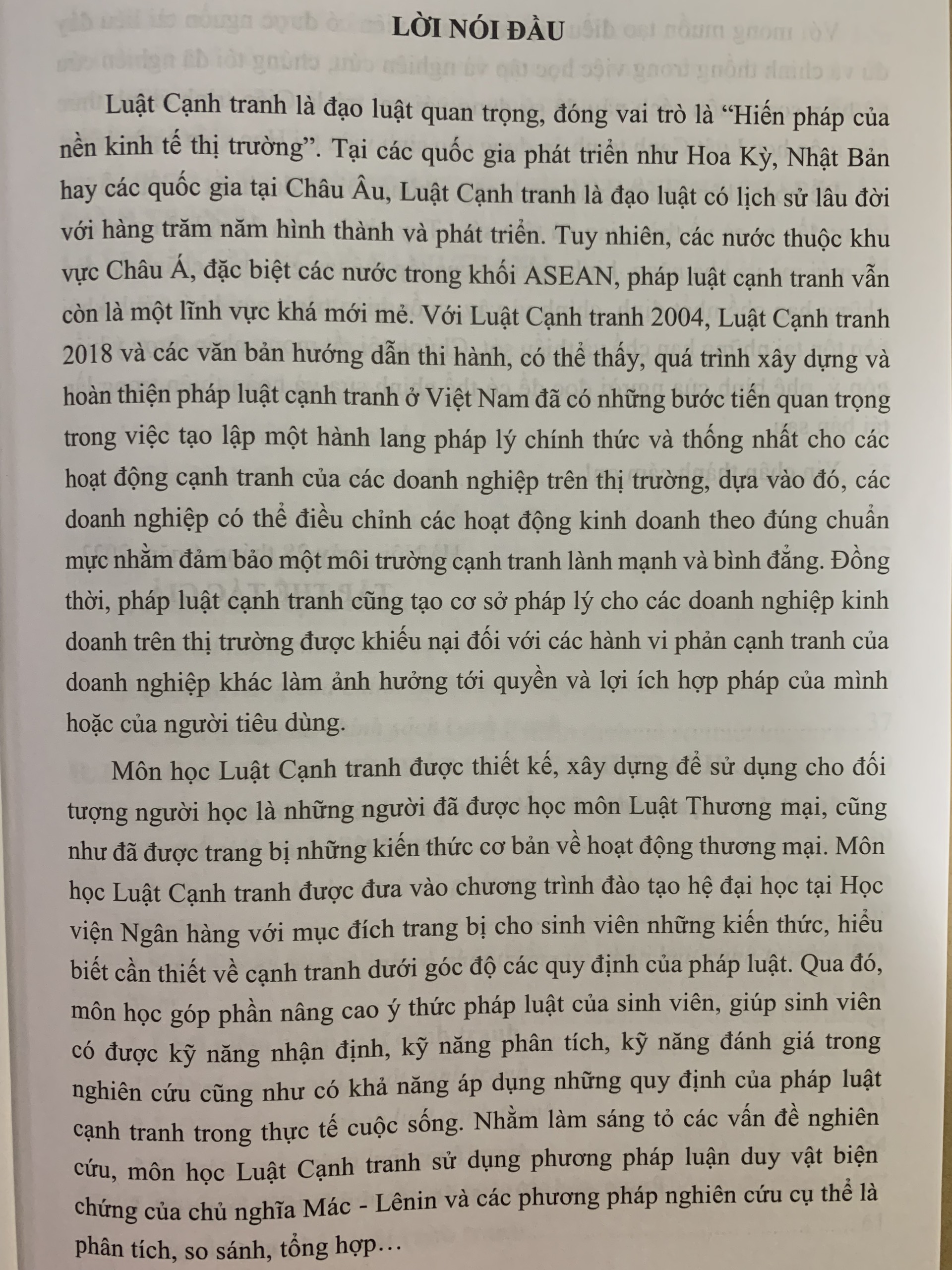 Môn học Luật Cạnh tranh được thiết kế, xây dựng để sử dụng cho đối tượng người học là những người đã được học môn Luật Thương mại, cũng như đã được trang bị những kiến thức cơ bản về hoạt động thương mại. Môn học Luật Cạnh tranh được đưa vào chương trình đào tạo hệ đại học tại Học viện Ngân hàng với mục đích trang bị cho sinh viên những kiến thức, hiểu biết cần thiết về cạnh tranh dưới góc độ các quy định của pháp luật. Qua đó, môn học góp phần nâng cao ý thức pháp luật của sinh viên, giúp sinh viên có được kỹ năng nhận định, kỹ năng phân tích, kỹ năng đánh giá trong nghiên cứu cũng như có khả năng áp dụng những quy định của pháp luật cạnh tranh trong thực tế cuộc sống. Nhằm làm sáng tỏ các vấn đề nghiên cứu, môn học Luật Cạnh tranh sử dụng phương pháp luận duy vật biện chứng của chủ nghĩa Mác - Lênin và các phương pháp nghiên cứu cụ thể là phân tích, so sánh, tổng hợ