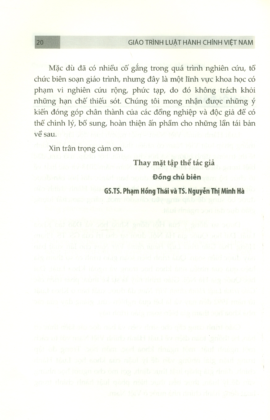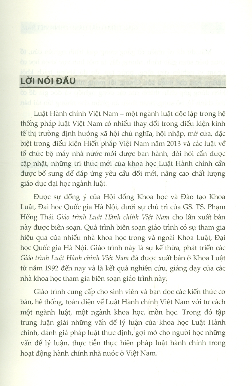 Chính vì lẽ đó, dưới sự chủ trì của GS. TS. Phạm Hồng Thái, cuốn sách Giáo trình Luật Hành chính Việt Nam qua quá trình biên soạn công phu của các thầy cô Khoa Luật, Đại học Quốc gia Hà Nội đã được ra mắt bạn đọc. Giáo trình là sự kế thừa, phát triển các giáo trình Luật Hành chính Việt Nam đã được xuất bản ở Khoa Luật từ năm 1992 đến nay và là kết quả nghiên cứu của các nhà khoa học tham gia biên soạn. Cuốn sách có dung lượng trên 600 trang, gồm 18 chương, được chia làm ba phần chính: